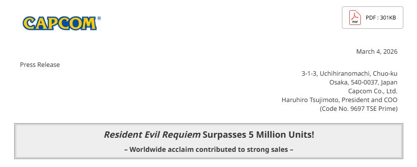昨天(3月4日),卡普空于其投资者关系(IR)官网发布公告,宣布《生化危机9:安魂曲》(以下简称《生化危机9》)销量正式突破500万份。