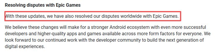 这对开发者而言,不仅意味着实际收入的增加,也获得了更大的支付与商店选择自由。值得一提的是,Android生态系统总裁Sameer Samat在公告中透露,Google与Epic Games之间的纠纷已得到解决。