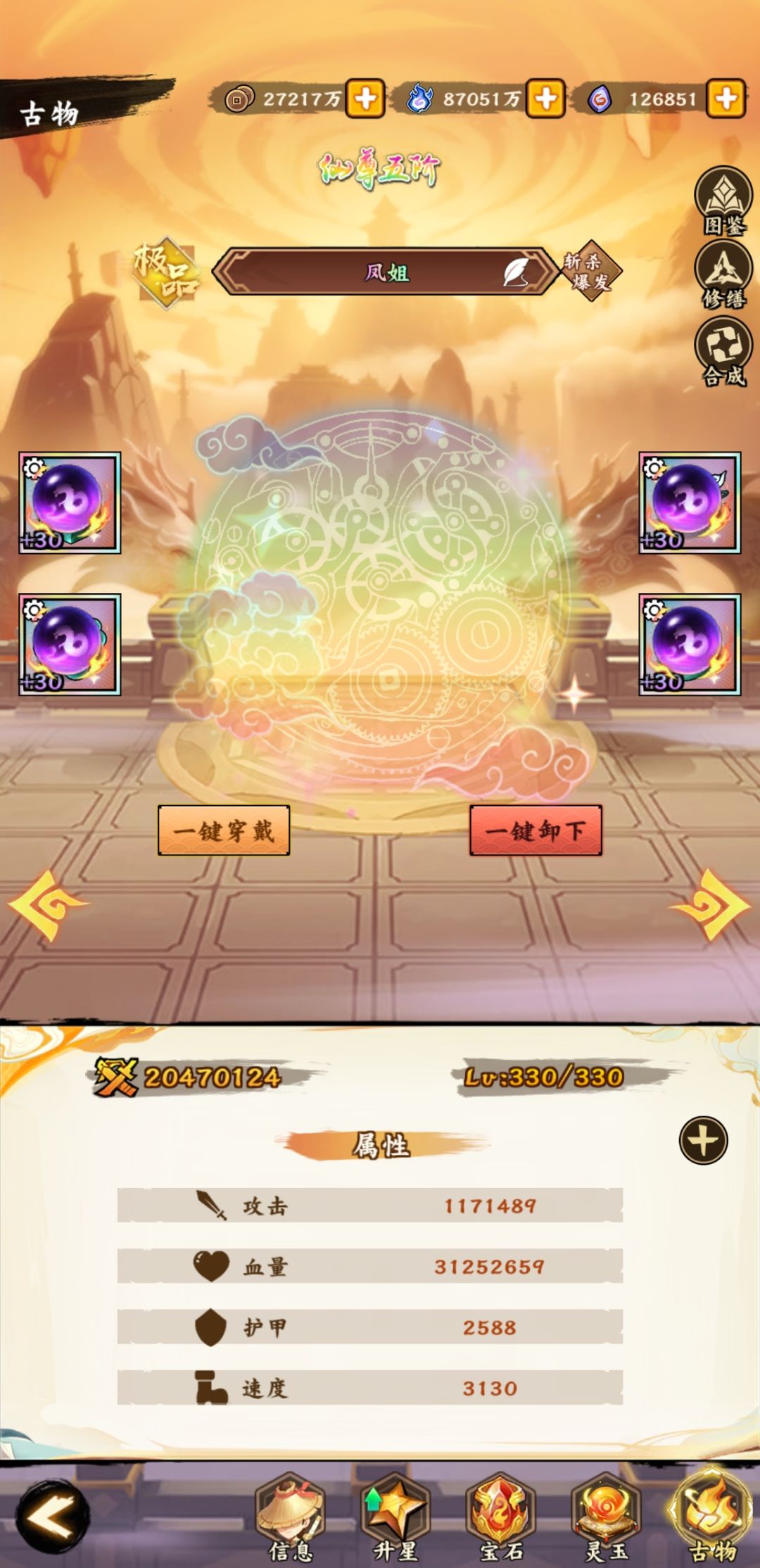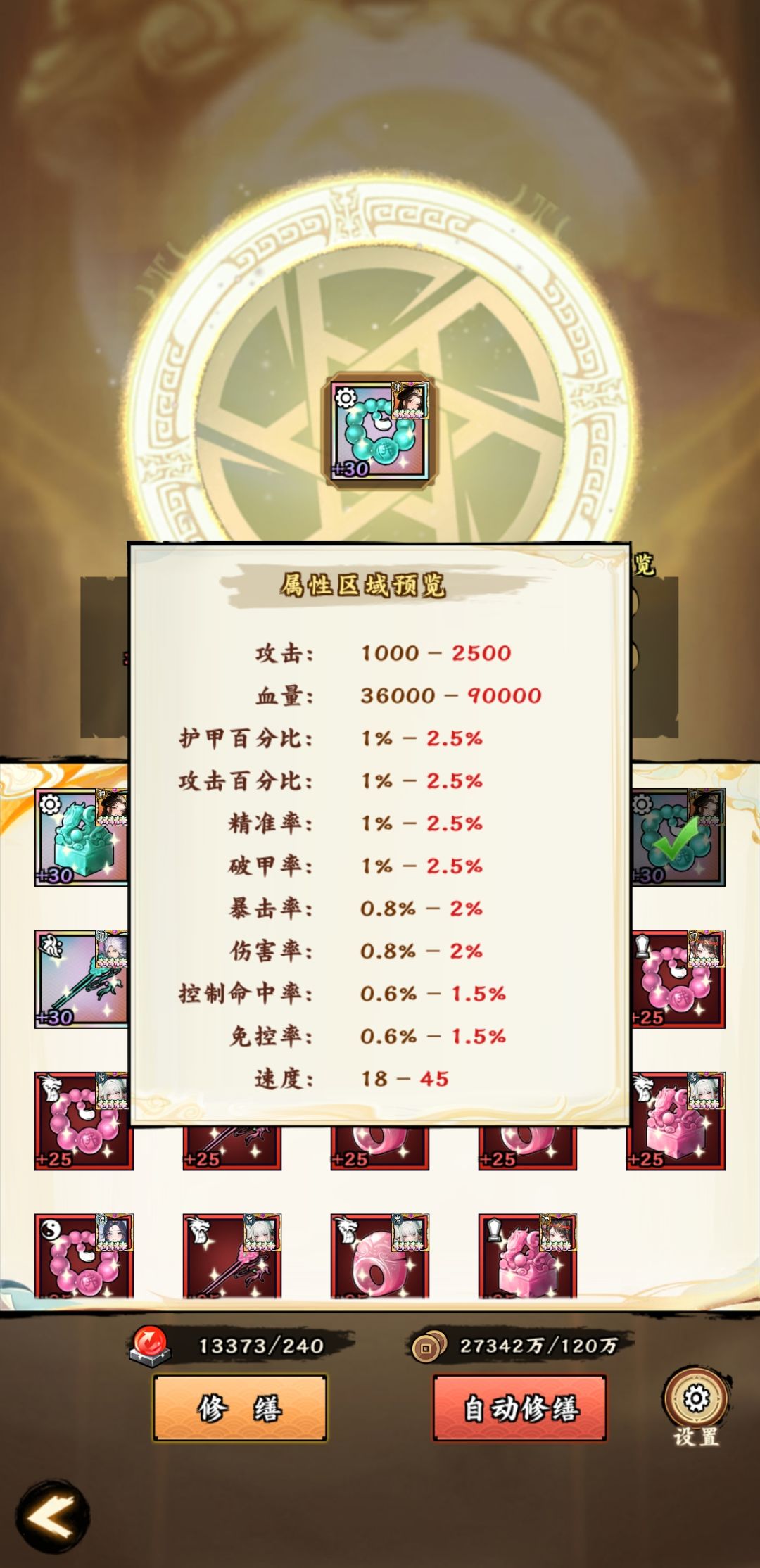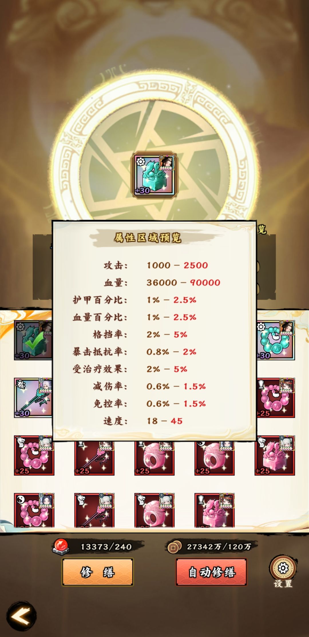 2、修缮古物属性不同,玉玺和头簪同属性(建议血量百分比、减伤率、速度)、佛珠和扳指同属性(建议攻击百分比、伤害率、速度)
