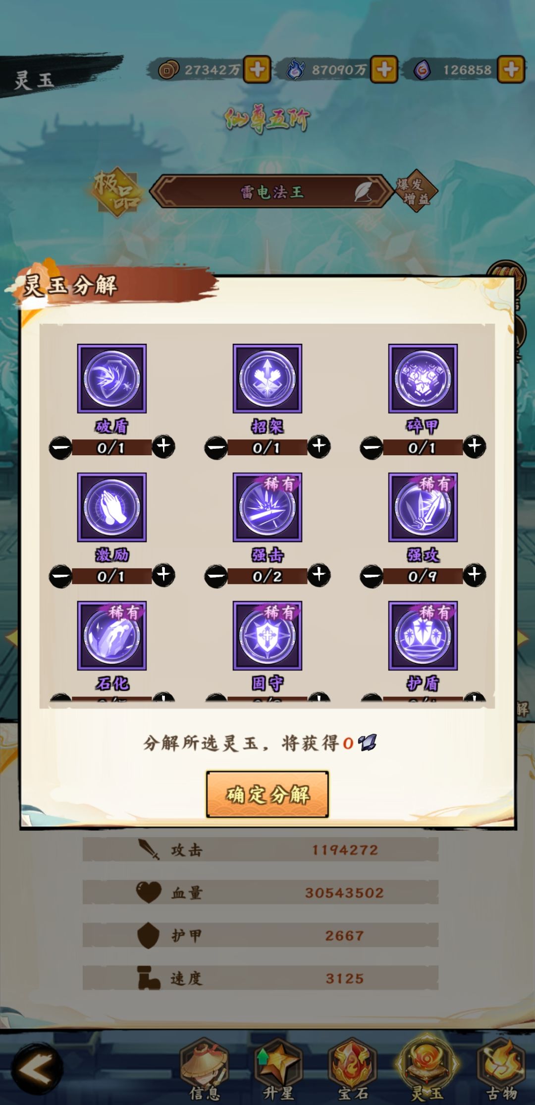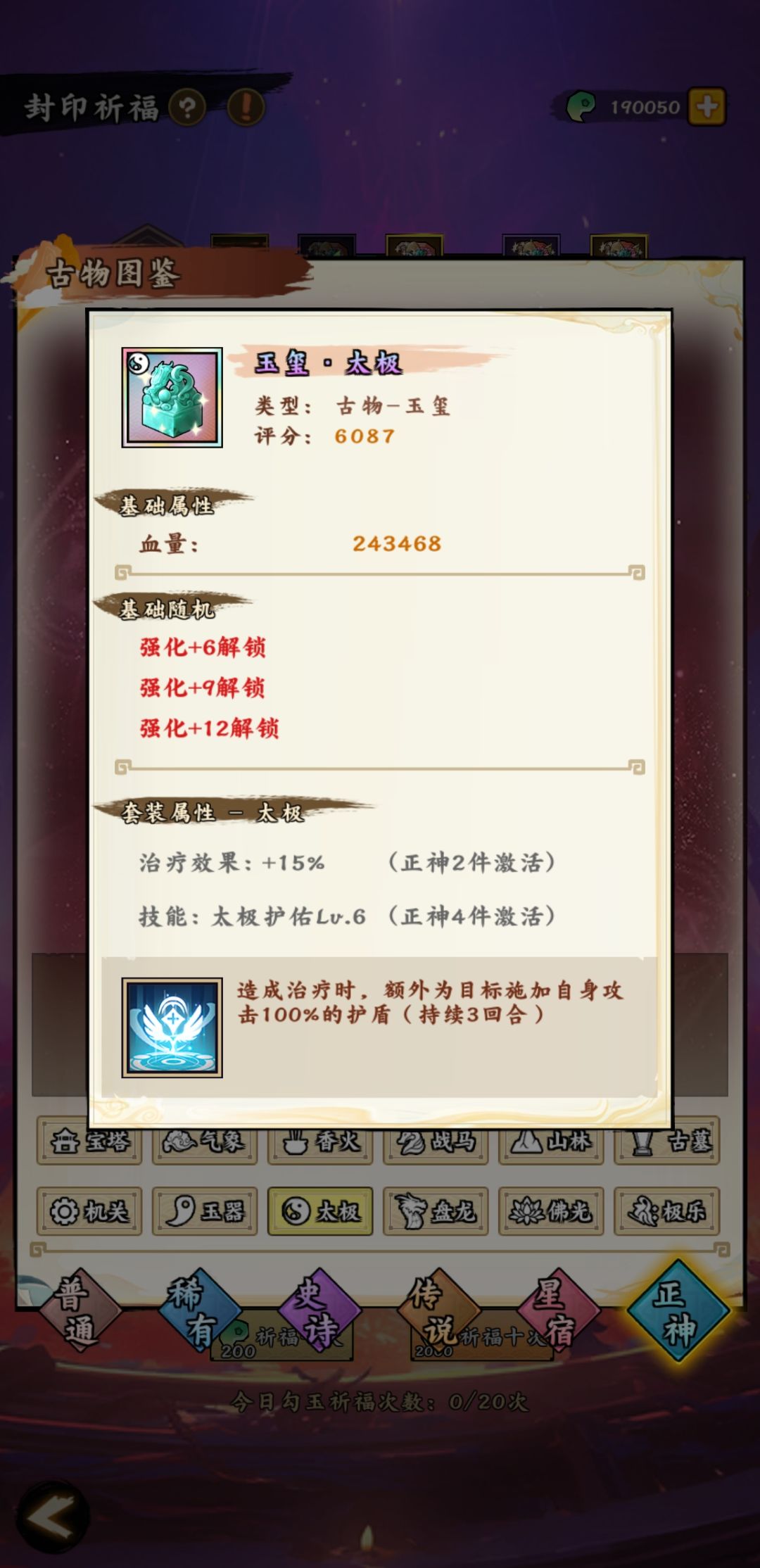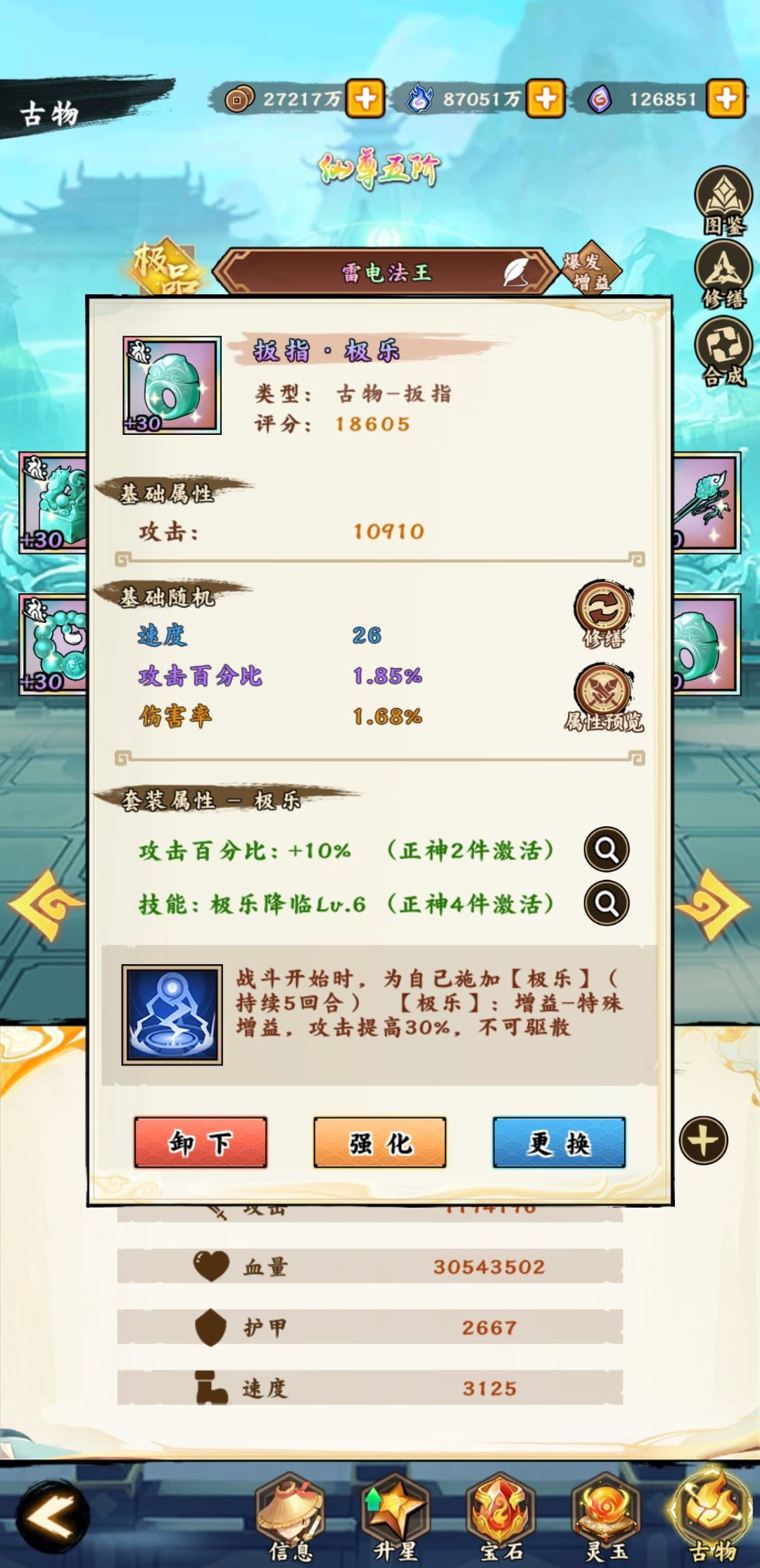 2、修缮古物属性不同,玉玺和头簪同属性(建议血量百分比、减伤率、速度)、佛珠和扳指同属性(建议攻击百分比、伤害率、速度)