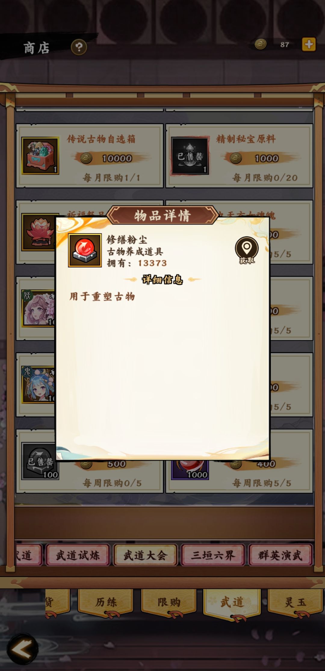 通过消耗“修缮粉尘”来获得古物属性。
