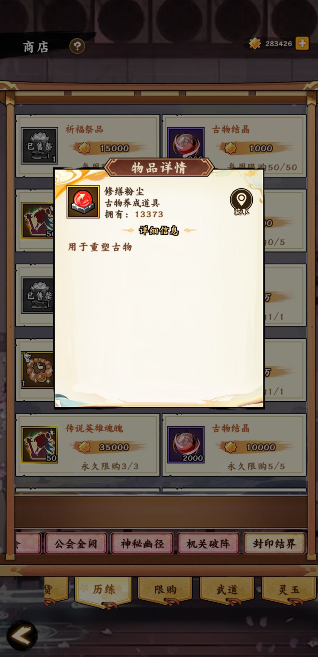 1、每周五8:00会开启“封印洞府”,没什么技巧,看见洞府就占据,越高级获取资源越多(相当于自动挖矿),资源可在“商店-历练-封印结界”中兑换修缮粉尘和祈福祭品(可去封印祈福抽取古物,全看脸,没什么技巧)