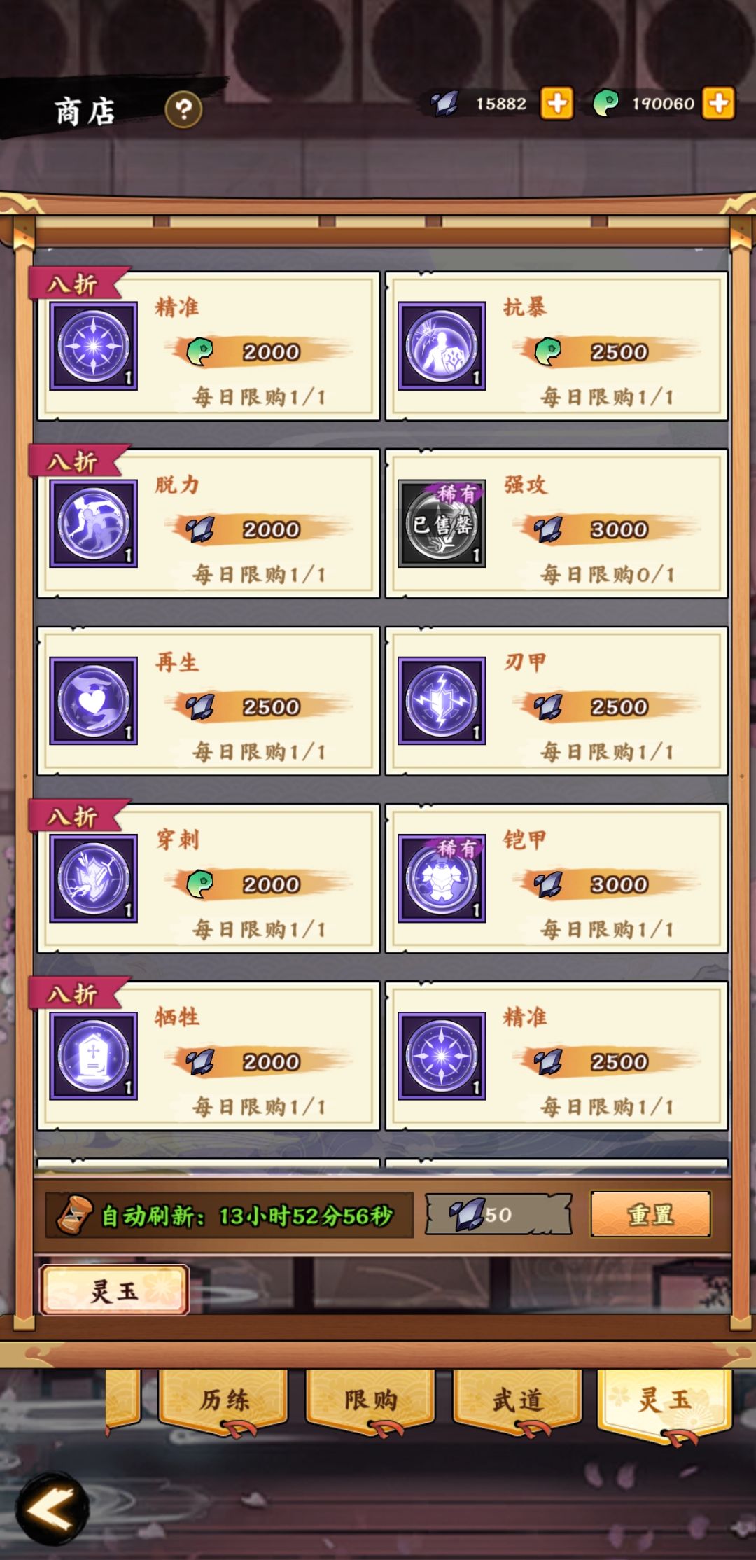 商店-灵玉,建议每天都去商店看一看,看到打折的,能用的,先购入。