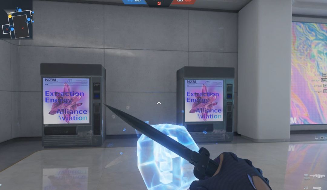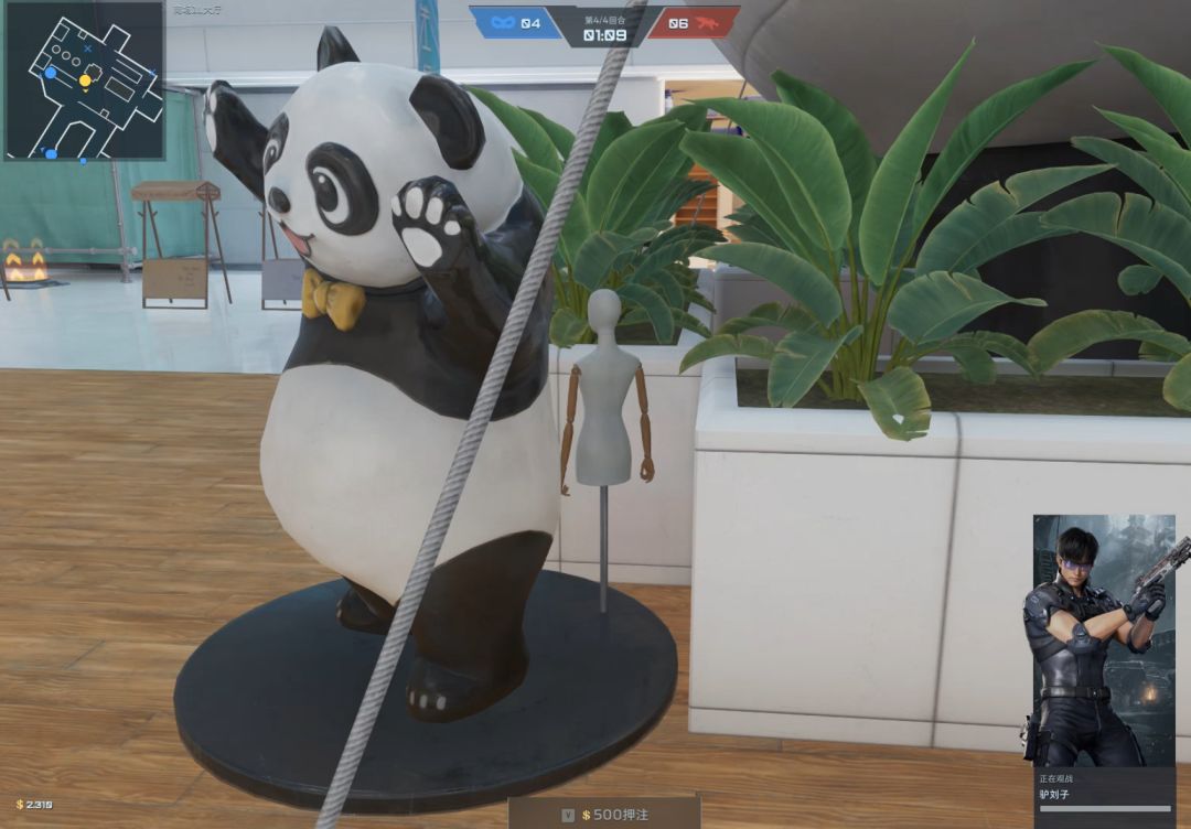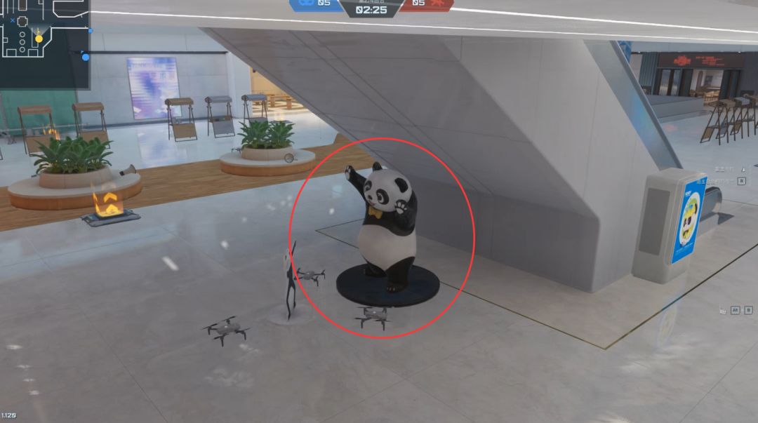 点位解析:在商场中央有四个熊猫,每个熊猫的后面其实是有一小块可以躲藏的区域的,如果我们变成的是较为细长的物品,那可以选择这个点位进行躲藏,就比如下图中的假人模特,刚好能够卡进熊猫的后面。