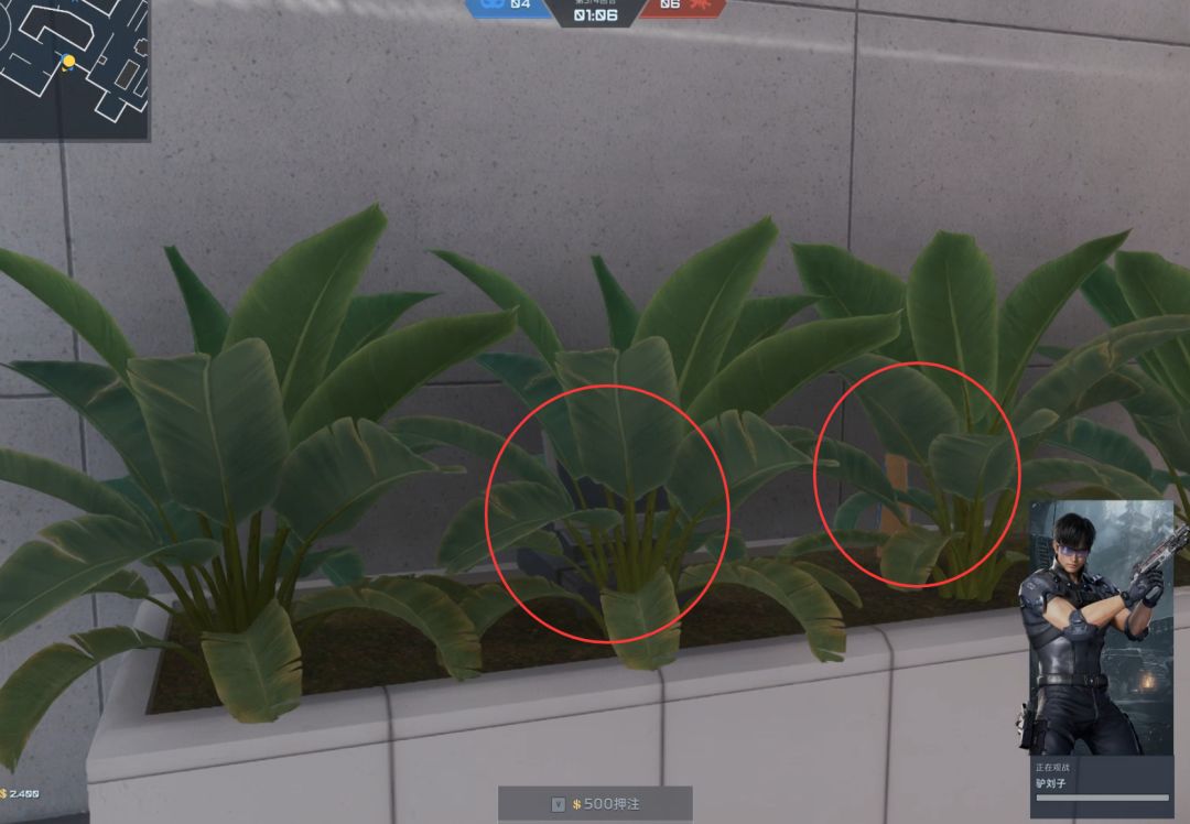 点位解析:地图中的花坛里会有一些绿色植物,而这些植物我们变成的物品是直接能够卡进去的,如果我们选到了较小的物品,就非常适合躲这个点位。