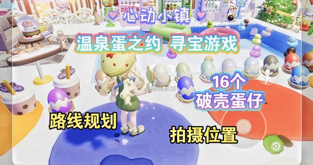 带你一次在冬日乐园内拍完16个破壳蛋仔 拍摄位置路线规划 冰雪季期间都可以去拍 — — — 【温泉蛋之约 寻宝游戏】 整个活动一共有16个不同颜色的礼物蛋需要拍摄,每天解锁一个新的礼物蛋,持续十六天。 拍摄后,可以在地图上某个位置获得拍摄的那个颜色的礼物蛋家具摆件。 每找到一个礼物蛋并拍照收集,可以获得5个满愿星和300潮流代币奖励。 拍完所有礼物蛋,可以领取【温泉蛋 食谱】奖励。 #心动小镇 #