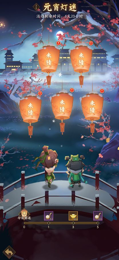 趣味猜灯谜,欢乐闹元宵!值此佳节,猜灯谜当然必不可少!活动期间,将每日更新5道谜题,选择正确答案后即可获得元宵团子、上元灯火竞猜奖励,还可领取每日答题进度奖励,获取元宵团子、元宝等海量奖励!