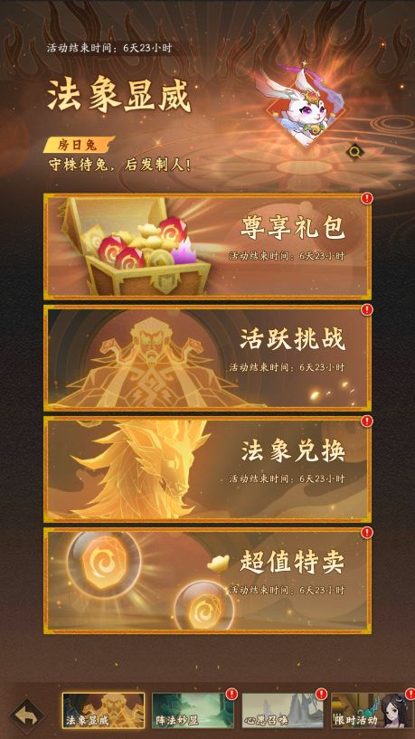 专属活动「法象显威」来袭!活动期间,道友们可通过完成【活跃挑战】或购买【尊享礼包】进行法象兑换,更有【超值特卖】活动限时开启!各位道友可以在本次活动中轻松兑换混沌法象碎片9选1、珍品法象碎片12选1、法魄珠、金品法宝碎片自选、紫品法宝碎片自选、神君令等超值好礼!