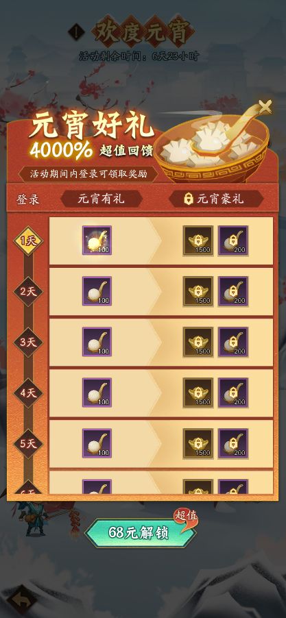 元宵圆圆糯糯,日子红红火火!4000%超值回馈【元宵好礼】限时登场!活动期间,每日登录即可免费领取「元宵团子」,道友们还可进阶解锁【元宵大礼】,领取更多海量元宝以及「元宵团子」!元宵团子将用于元宵商铺兑换超值元宵好礼~