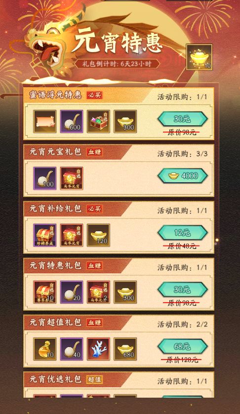 瑞雪丰年,好运相伴!【元宵特惠】活动期间,道友们将以超高折扣价购买不同礼包,进而获取「蜜语浮元」气泡框、马年元宵奇宝(内含神兵碎片21选1、御灵碎片17选1)、珍稀养成礼盒、尊享养成宝箱、无双御灵碎片14选1、神魔伙伴自选、元宵团子以及海量元宝等超值好礼!多重折扣,欢乐加倍!