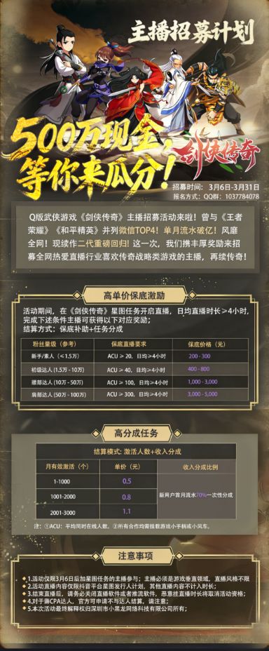 报名方式:QQ群:1037784078,备注【我要当剑侠】。前50名送开播大礼包!机会难得,速来!