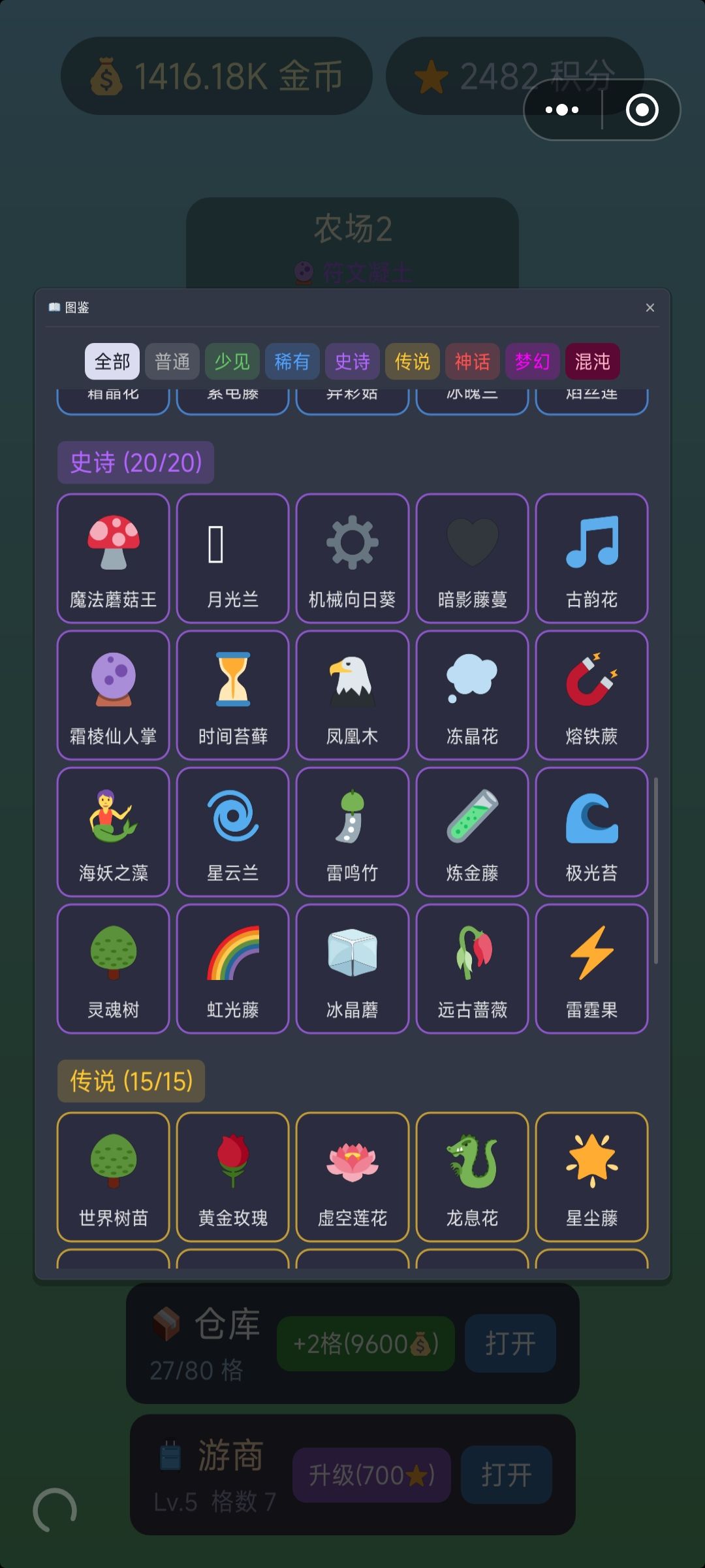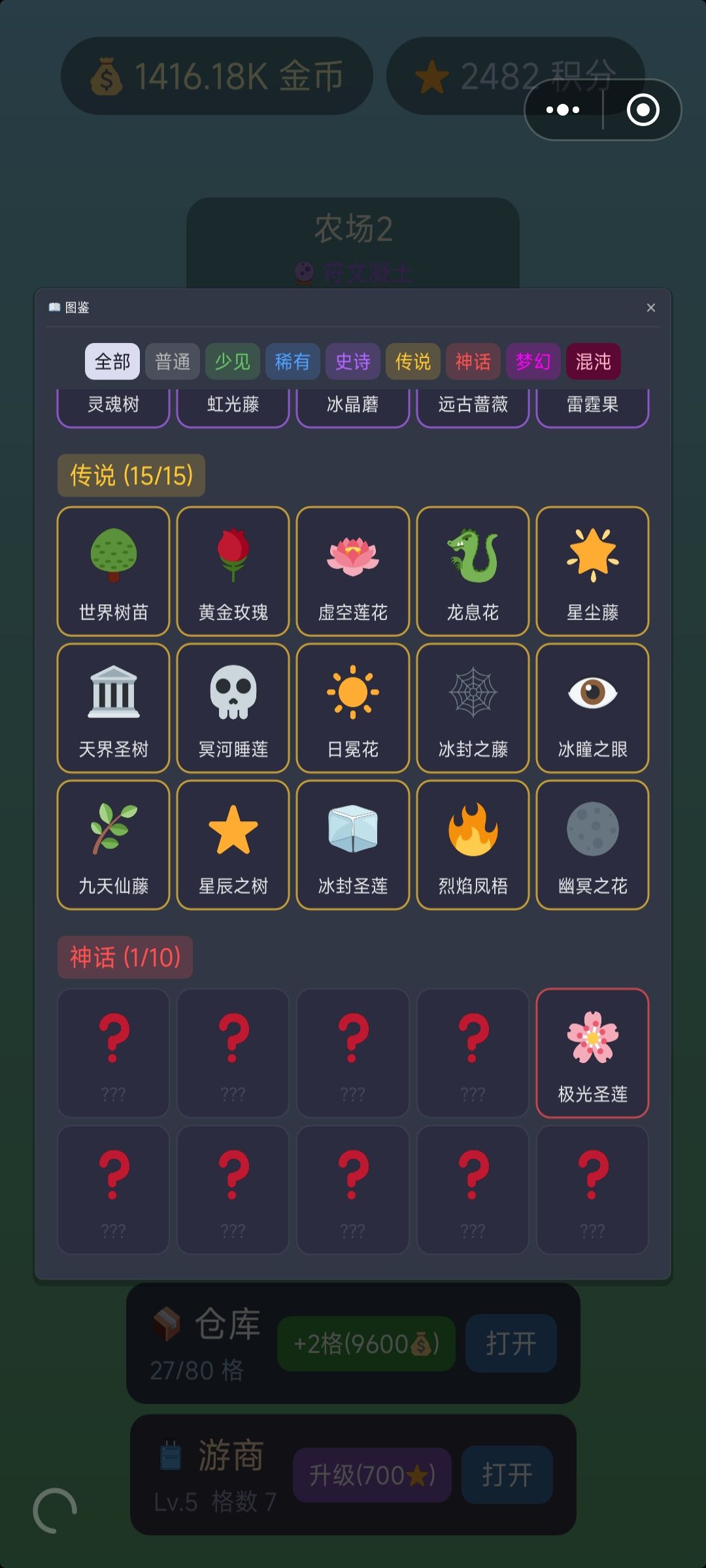 另外吐槽一下图标问题,有的作物是一样的,比如冰魄兰和月光兰,都是个框(图案缺失),另外还有三个彩虹图标的作物,搜集的时候我一直当成已经有的直接过了,一直到最后怎么刷都刷不出来新的我才去一个个对着找,这才发现原来我早就错过那么多次了。