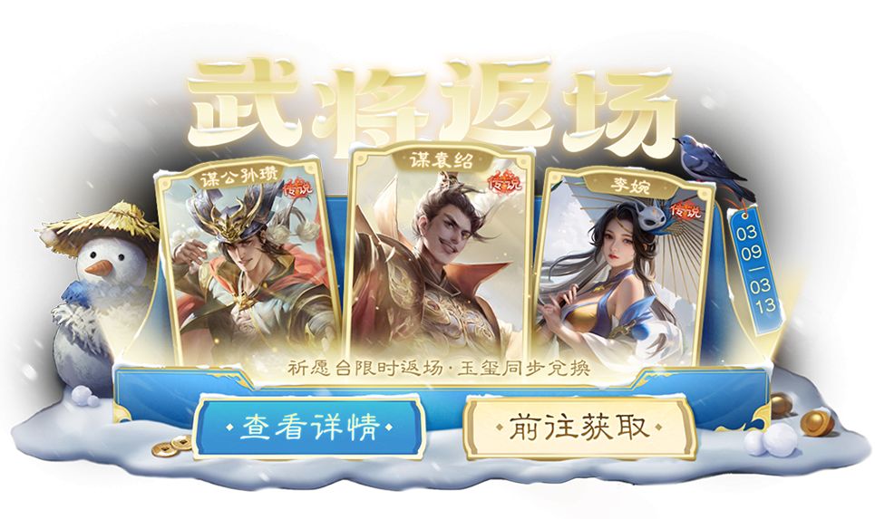 *本期上新 早春龙珠活动(谋袁绍),返场 庆典龙珠活动(谋公孙瓒)、小寒龙珠活动(胡金定)、腊月龙珠活动(李婉),龙珠可购买时间:2026-3-9 00:15:00~2026-3-13 24:00:00;