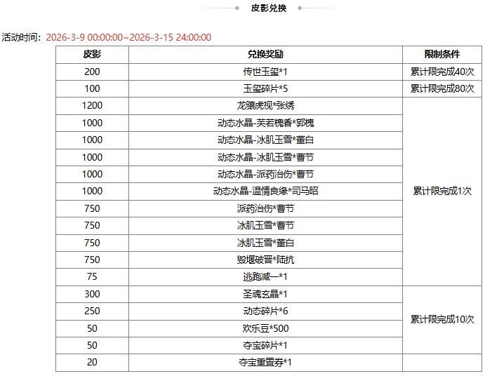 1、皮影可兑换奖励,若兑换奖励是在此次活动前已拥有的永久武将、皮肤、三国秀,则无法重复兑换;