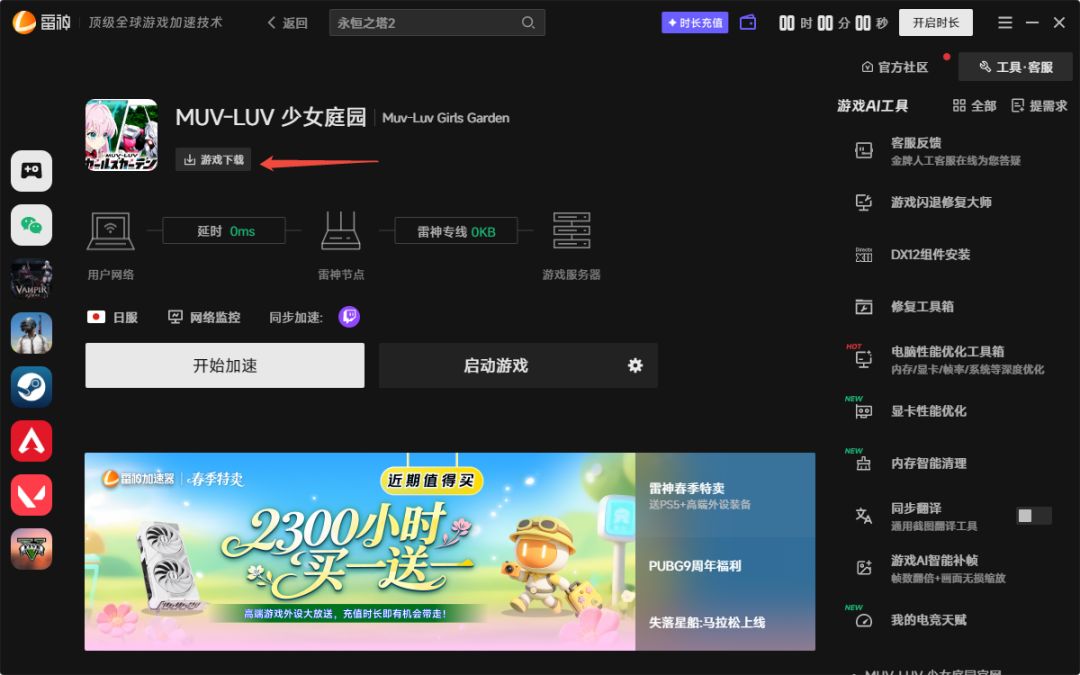 ① 使用雷神加速器搜索“MUV-LUV少女庭园”并开启加速。