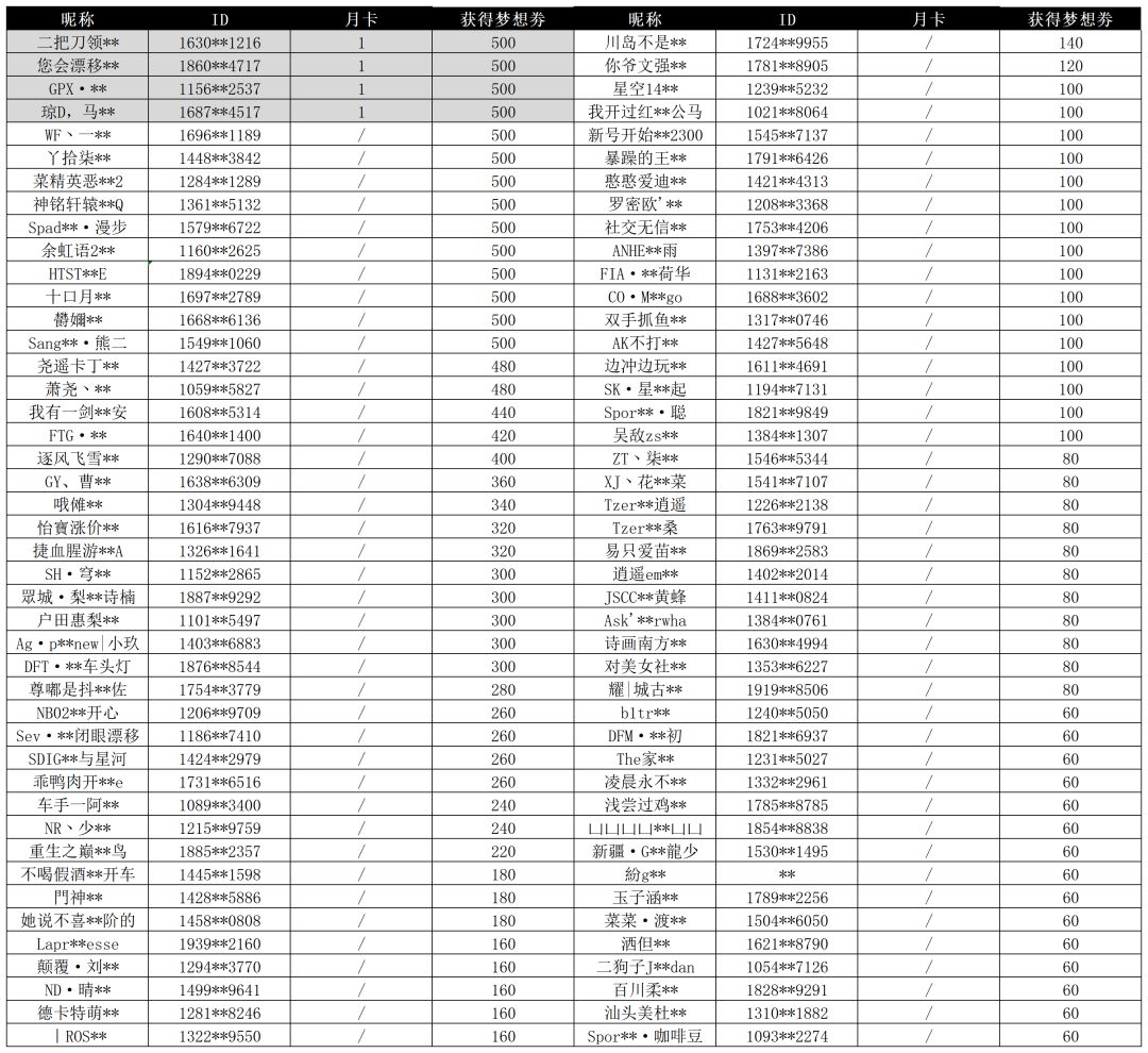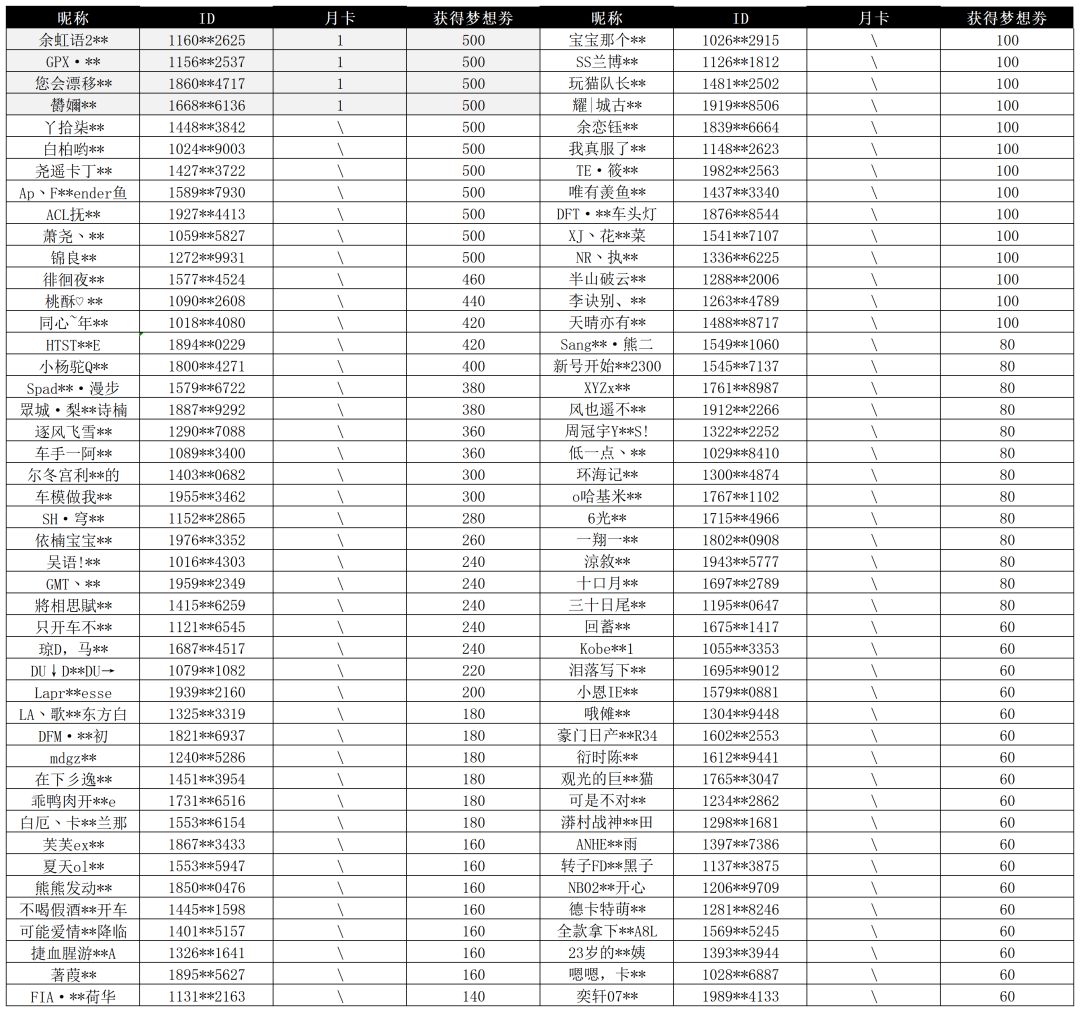 单周排行榜奖励:单轮第1-3名分别获得100/80/60张梦想奖券;每周总榜单前4名额外各获月卡1张;
