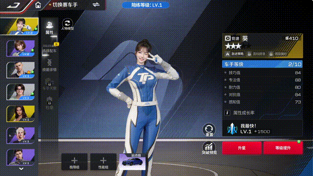 招募后可升级培养车手等级、了解车手的技能、天赋和档案;同时每位车手都有三个组别的配车,每辆车性能不同,只有适配车手才能发挥全部实力,还有一键装配功能,帮大家自动选择最合适的赛车,省时又便捷。