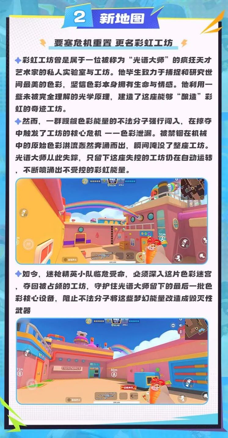 新春伊始,万象更新!《迷你枪战精英》三周年庆典即将来袭,福利重磅冲顶!猪猪侠持续助阵,多重精彩活动轮番上线!全新狂暴模式热血登场,叠加狂暴 buff ,越战越勇、愈战愈强!新地图彩虹工坊缤纷亮相,多彩战场,激光开战!更有全新机甲重磅加入夺金模式,庄园财宝,予取予求!