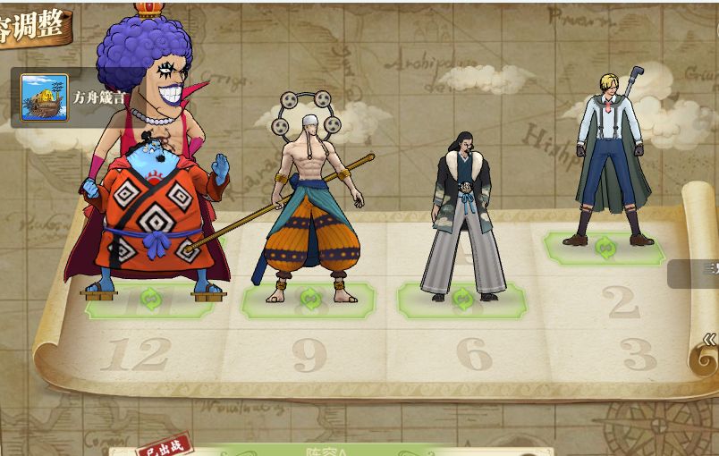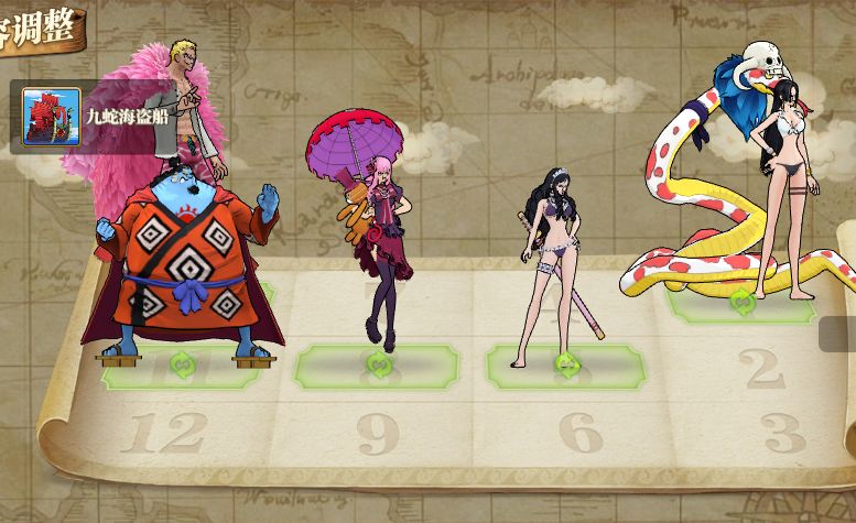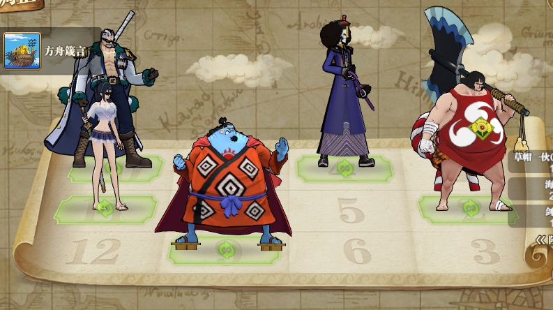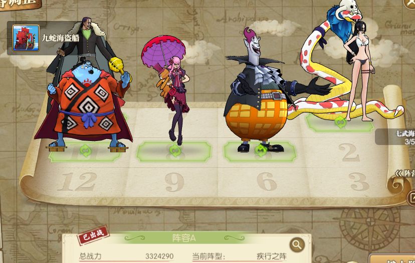 这套区别于带沙鳄鱼的配阵,其实就是以前多弗拉门+baby5的配阵,只是把糖糖换成了甚平,思路跟以前的七武海其实也没有很大的差异。