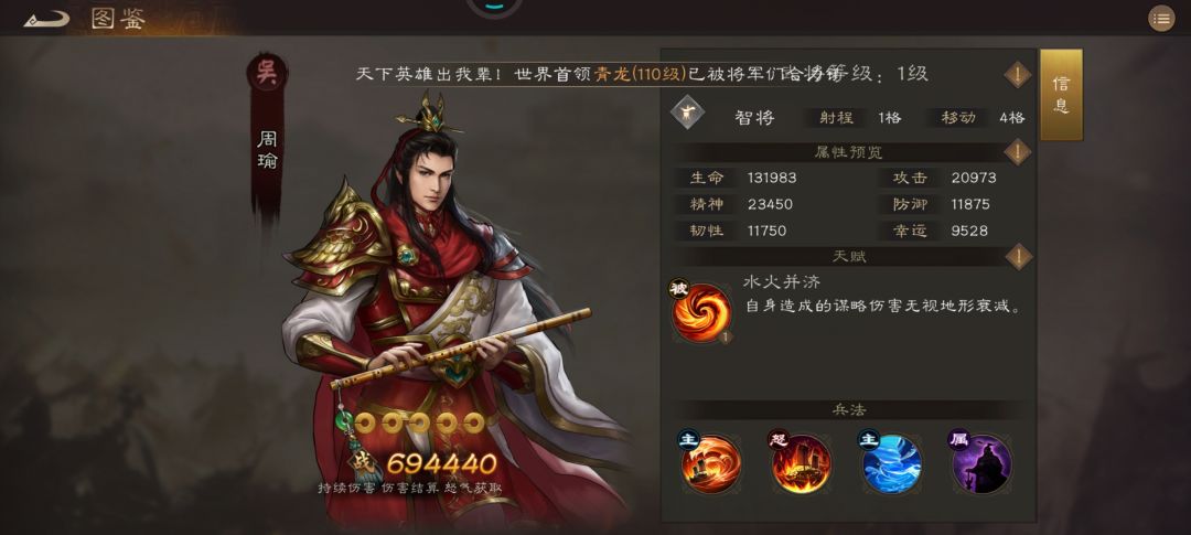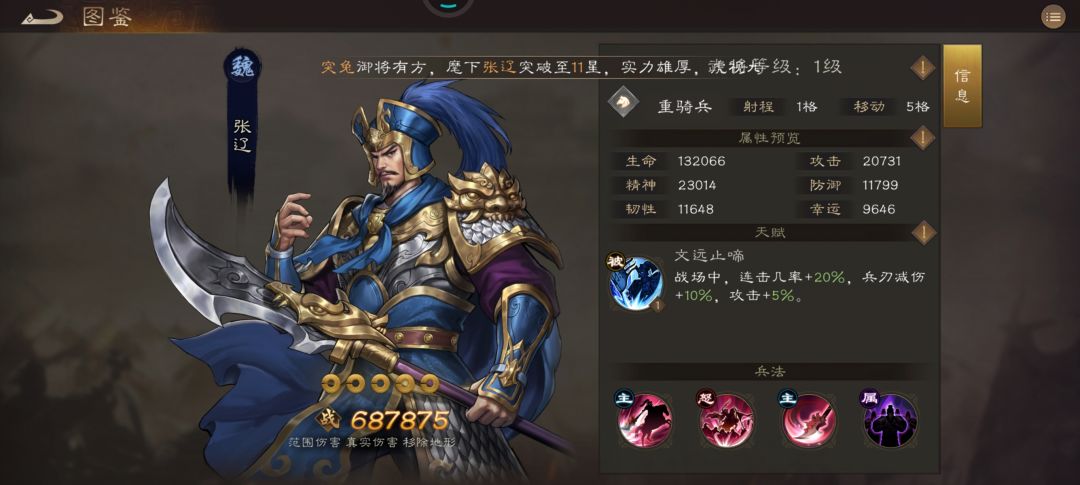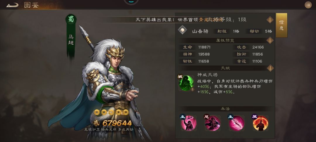 榜单解析:特性多段范围真伤,非常强力的伤害机制,尤其在再动马和貂蝉的配合下,可一回合打出5段范围真伤,必然会在未来的PVP和PVE大方异彩。此外,其非持续性非百分比真伤不受双抗限制,妥妥沙盘神将!神兵技能能够将高连击转换为高额减伤,使其成为输出与坦度兼顾的重装输出骑兵,值得入手。