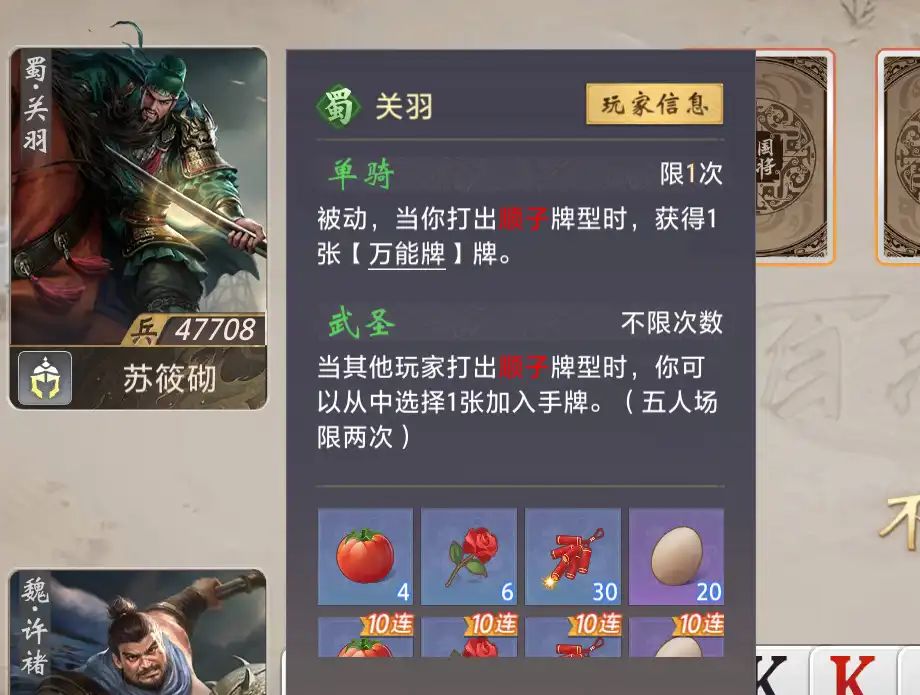 例如这局游戏我选了个许褚,在对方有关羽的时候,出顺子就变成了一种限制。如果随便出顺子,让关羽拿走关键牌,或者让关羽轻松组成顺子获得万能牌,那他优势就会特别大。