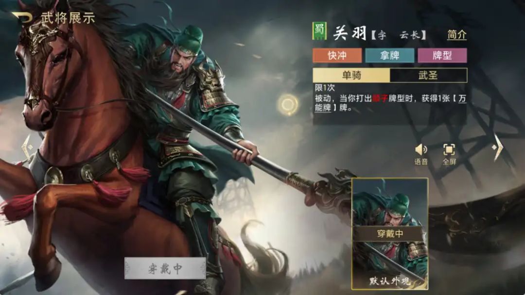就拿我最喜欢的三国武将关羽说起,在游戏前期就能解锁关羽,他的技能全程围绕“顺子”展开。技能“单骑”在打出顺子牌可以获得一张“万能牌”,可以代替任何牌,还能组成炸弹!另一个技能是“武圣”:可以在其他人打出顺子的时候顺走其中一张牌,非常的灵活!
