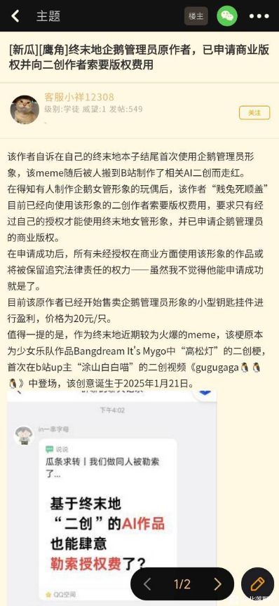 据悉,终末地企鹅管理员形象源自高松灯企鹅二创梗的衍生创作,凭借可爱造型走红网络。该作者完成版权申请后,提出版权费用诉求,这一操作让不少网友感到意外,也掀起关于二创作品版权归属、衍生创作边界的讨论。