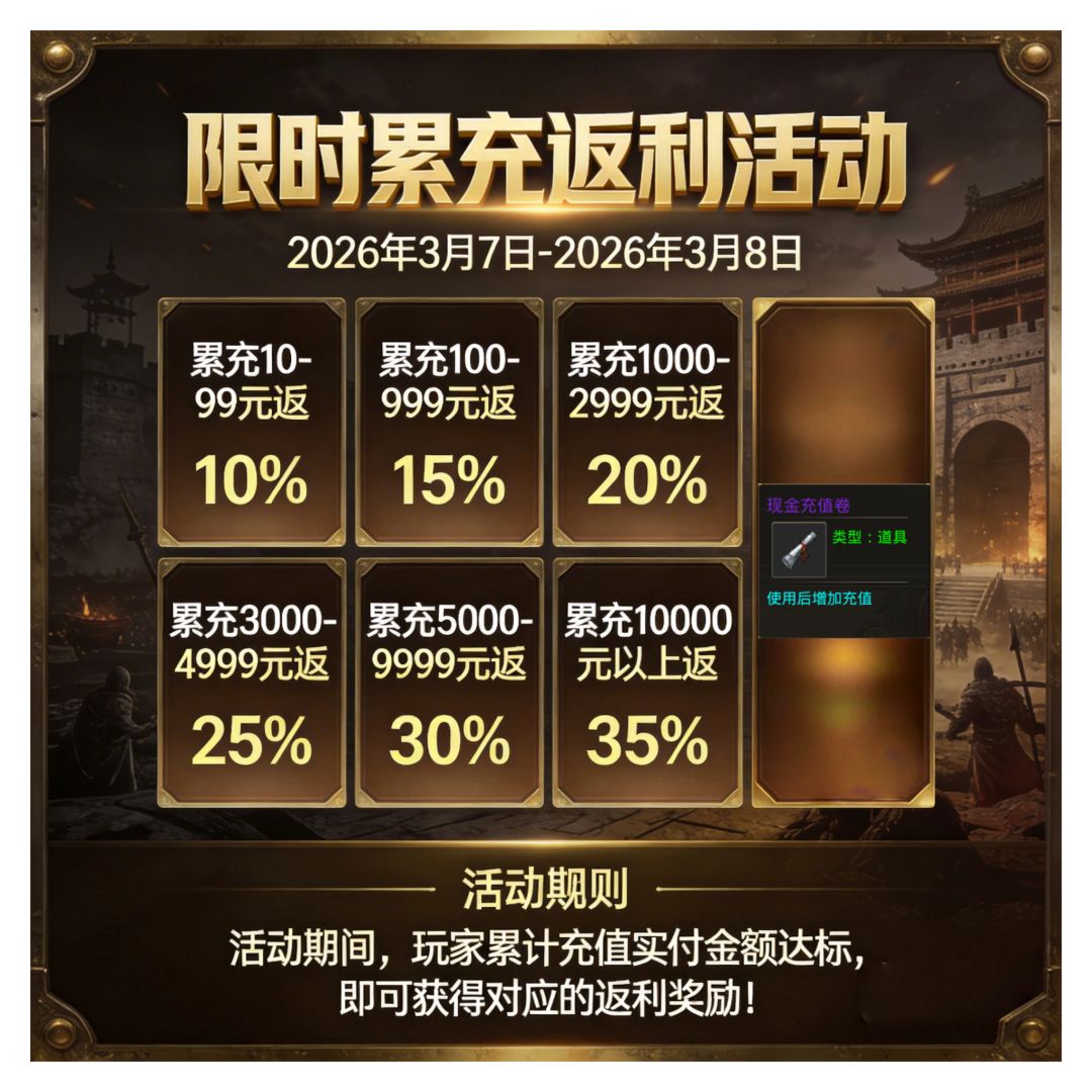 1、累充金额从2026年3月7日0点开始计算,2026年3月8日23:59点结束;