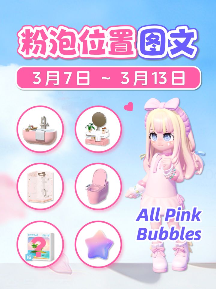 4、粉色泡泡内物品随机:粉色卫浴家具四件套(非必出),满愿星、金币等道具