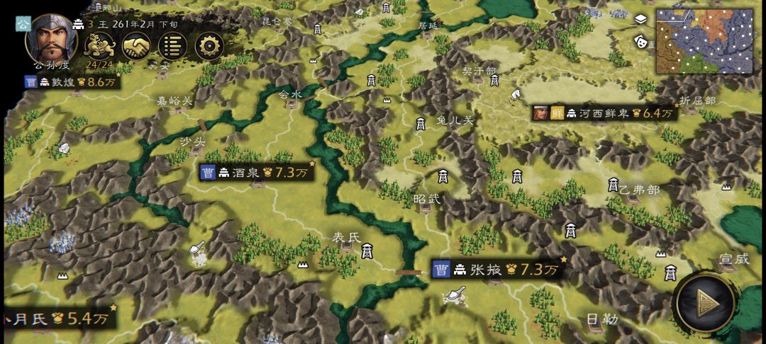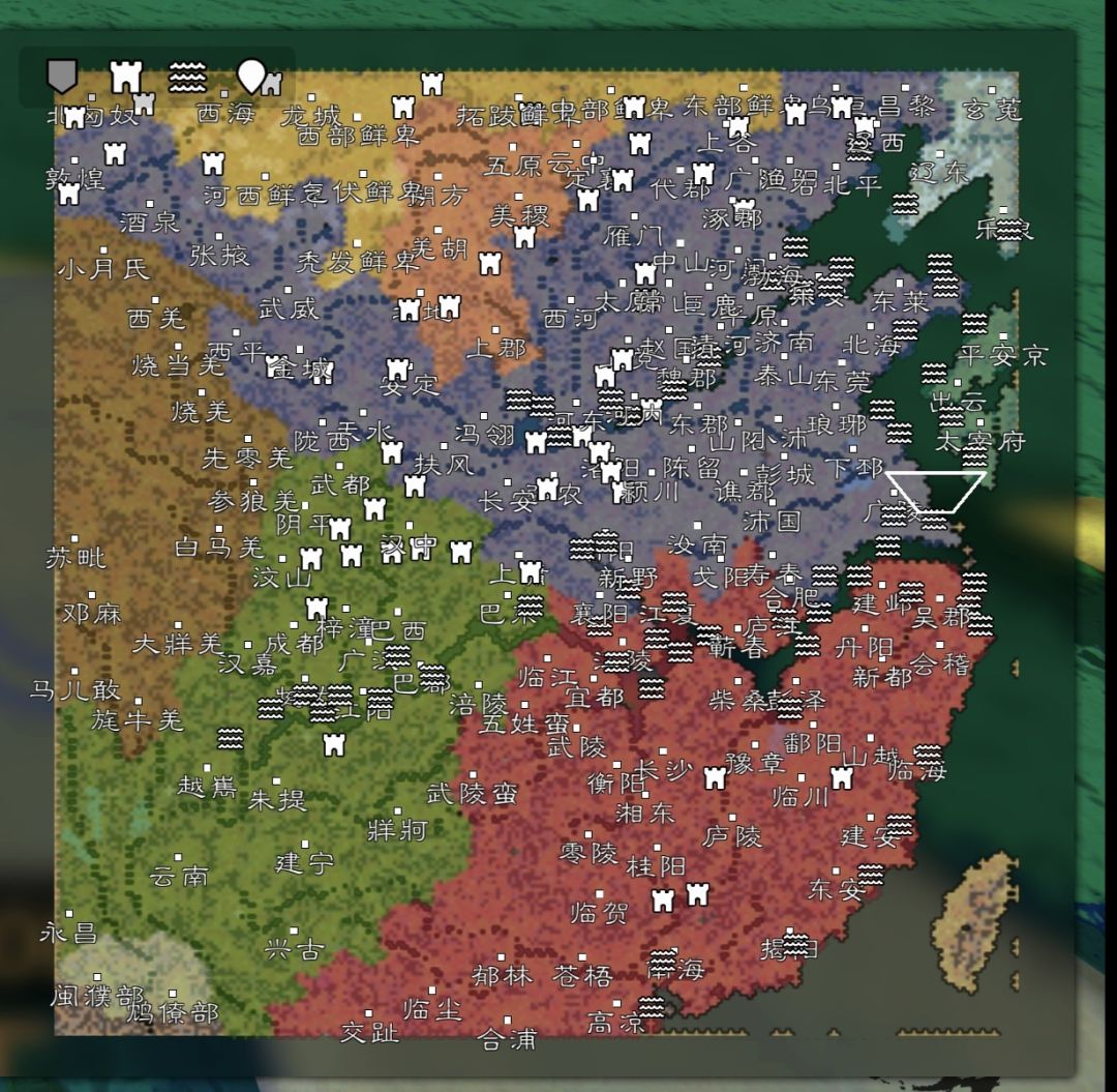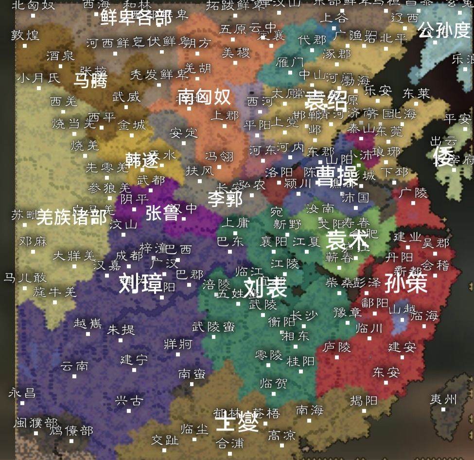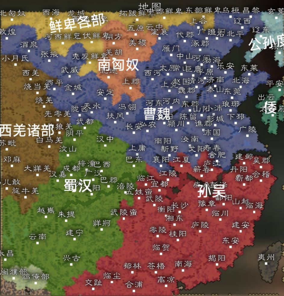 2.地图用了汉末州郡图(规模是极大地图;原作者@炸南瓜)剧本以天下三分为背景(因为是架空剧本,所以所有人物都在,上至东汉未年,下至西晋初年都有地图也不局限于某一年份)