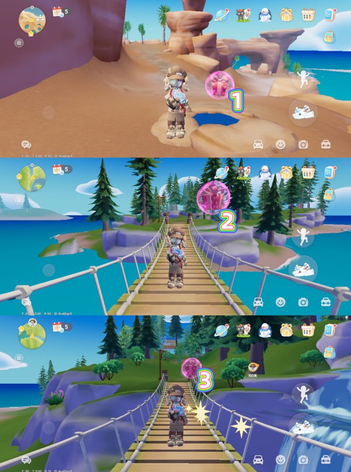 粉红泡泡(3.7-3.13)位置分布:图一地图的15处爱心标记,分别在温泉山1处、森林6处(⑦号泡泡来回飘动)、渔村2处、花田3处、城镇3处。 粉红泡泡里有随机送拼图盒子、家具、满愿星和材料!