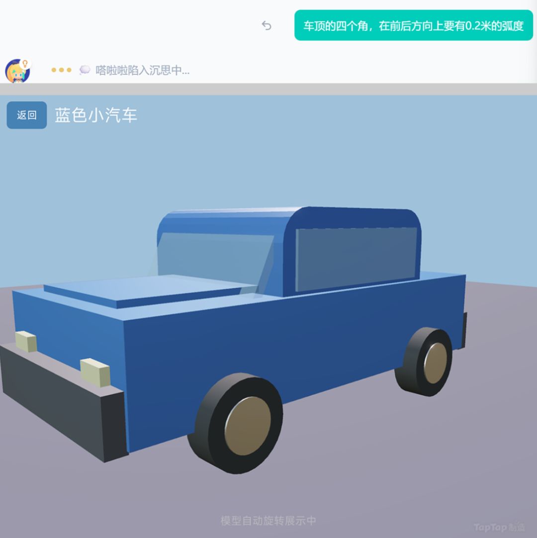 接下来再说说AI自己绘制模型该怎么操作,比如我让AI画一个蓝色小汽车(参考图四),我们会发现它的质量要比未来战士差一些,但它的优势是可以自己修改。