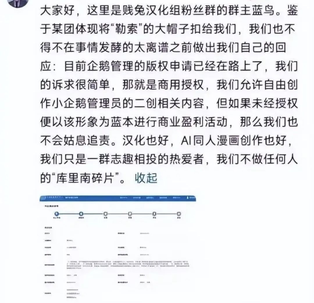 面对质疑,作者辩解称仅登记“企鹅玩偶服管理员Q版二创形象”,不禁止非商用二创,但仍坚持商用需授权付费,这一说法并未平息争议。不少玩家直言:“靠AI蹭热度火了,转头就锁版权恰饭,把二创圈子当韭菜地”,也有法律向网友指出,AI生成内容的版权认定以人类独创性智力投入为核心,纯AI生成内容难以构成受完整保护的作品,且二创商用本身已涉及原作IP侵权,作者此举法理站不住脚。