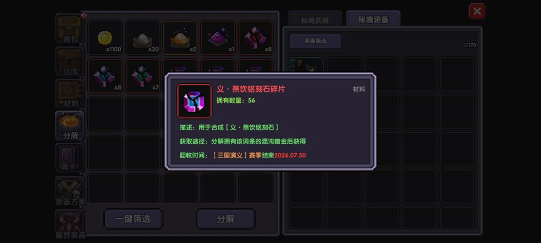 这个视频只举例了两个,也可以把所有的都这样合成,由于身上穿的六个装备还占六个位置,所以为了更方便可以把身上的装备放到仓库,这样的话,一下子可以运行25件装备,而且由于选装备和刻印是分开的,如果想刻别的的话,也可以进行更改。当然这还不够全自动,因为还要包含分解和在垃圾匠仓库取装备,这些流程也可以进行录制(下面这举例分解)