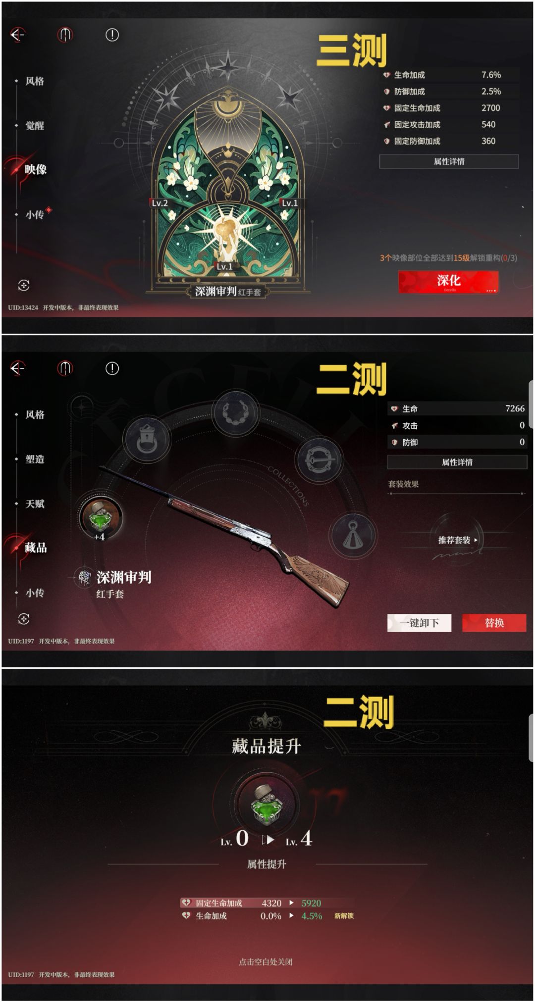 p3是养成界面,二测的【塑造】就是三测的【觉醒】,通俗解释就是命座,改了名称但内容没变;三测删去了【天赋】和【藏品】,改为【映像】。