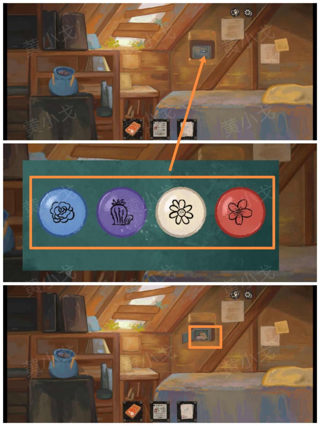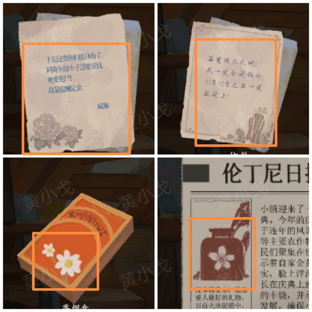 42.点击暗格中的保险柜上的机关,根据上面的颜色提示,结合【香烟盒】、【报纸】和【信件】上的花朵图案和颜色线索,调整密码锁,打开保险柜,查看里面的旧照
