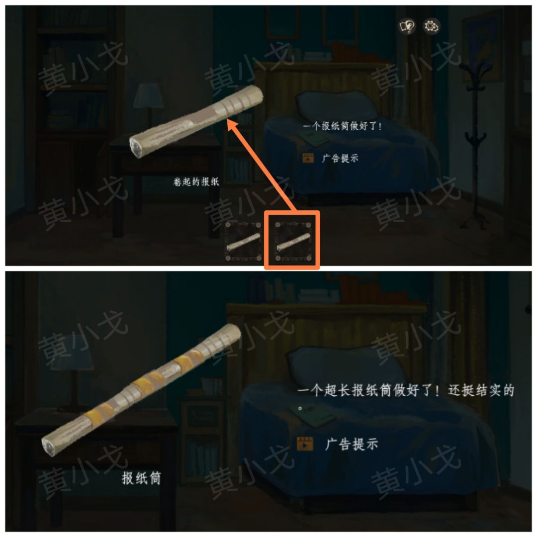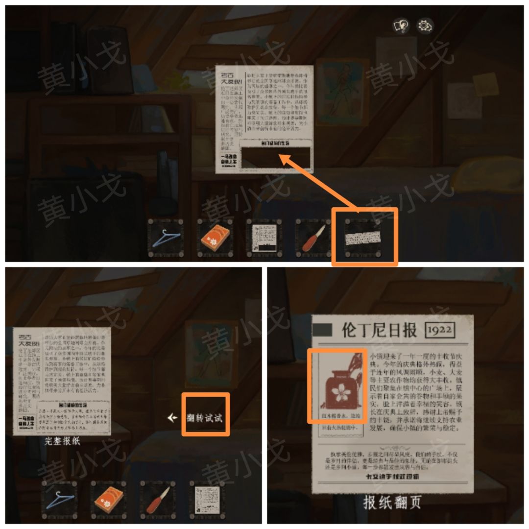 38.给【报纸】拼上【报纸条】,获得【完整报纸】;然后翻转报纸,获得【报纸翻页】