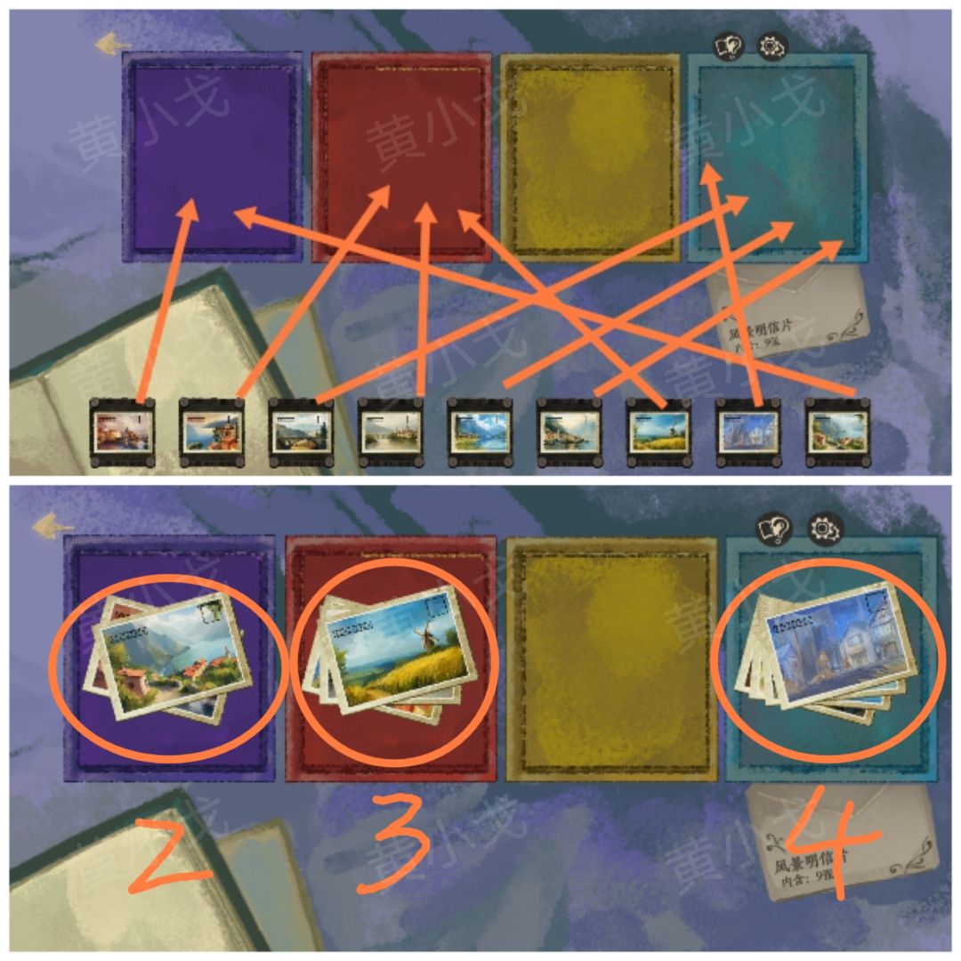 🔶盒子的颜色及里面的明信片数量:紫-2、红-3、黄-0、蓝-4