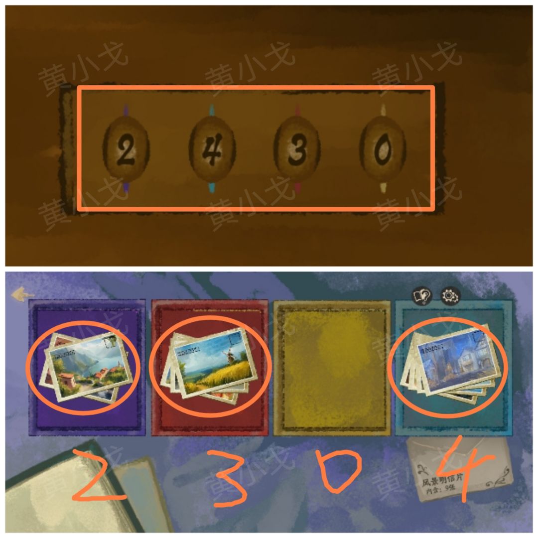 17.点击桌子抽屉上的密码锁,根据上面的颜色提示,结合盒子的颜色及里面的明信片数量,输入密码:2430