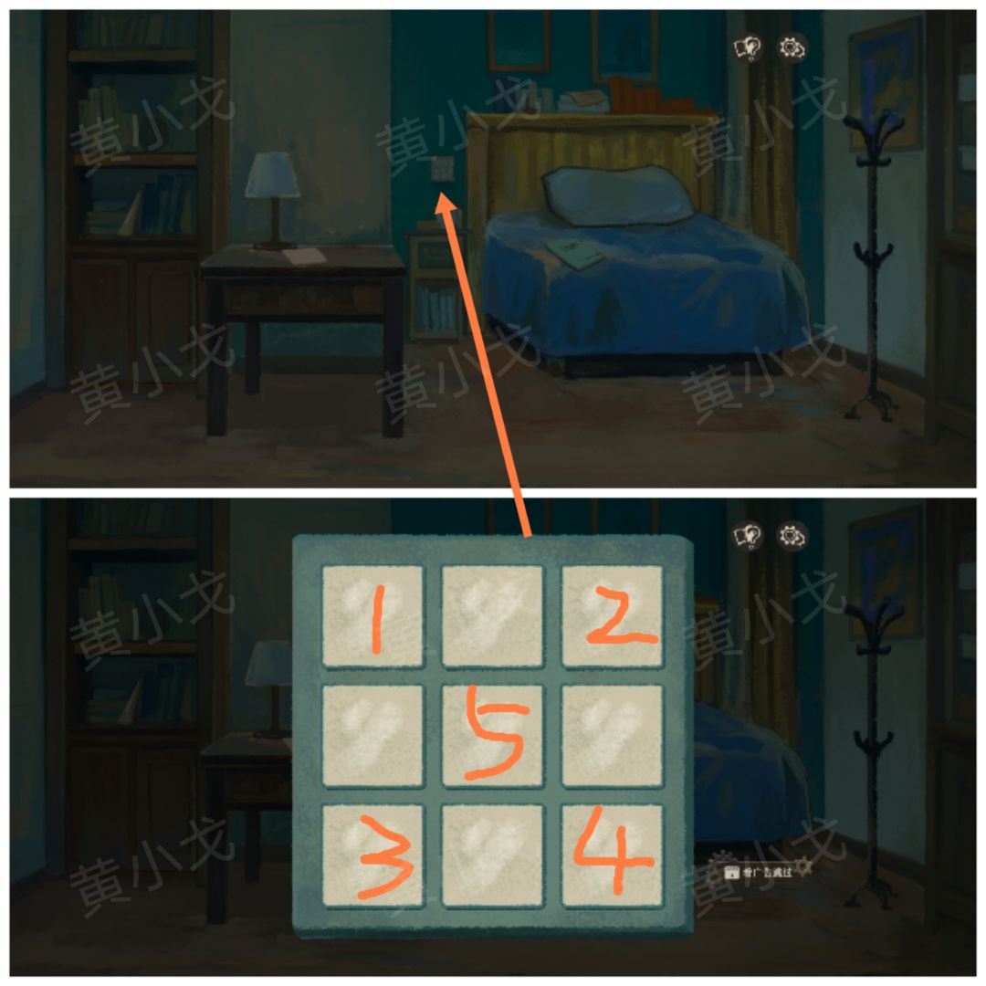 22.点击墙上的开关,完成九宫格解谜小游戏,打开灯