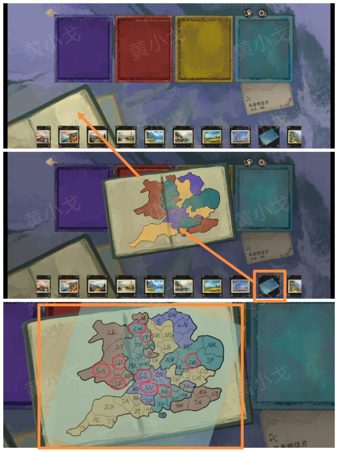 16.根据九张【明信片】上的编号和地图上的区域颜色及里面的英文缩写,把九张【明信片】放到对应颜色的盒子中,获得线索