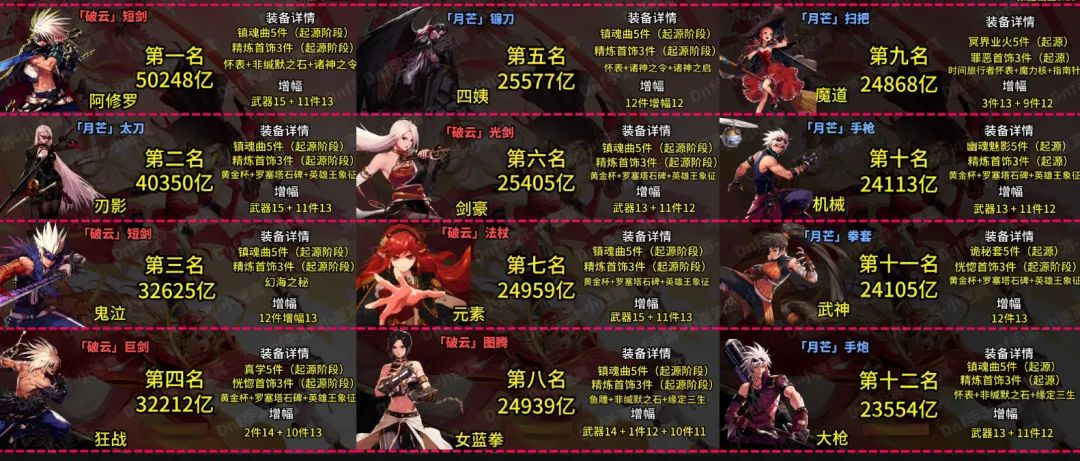 然后就关于“装备搭配”了,实际上这个也没有绝对一致性答案,不过上榜玩家都是各职业中数一数二的大佬,用来借鉴一下还是可以的。