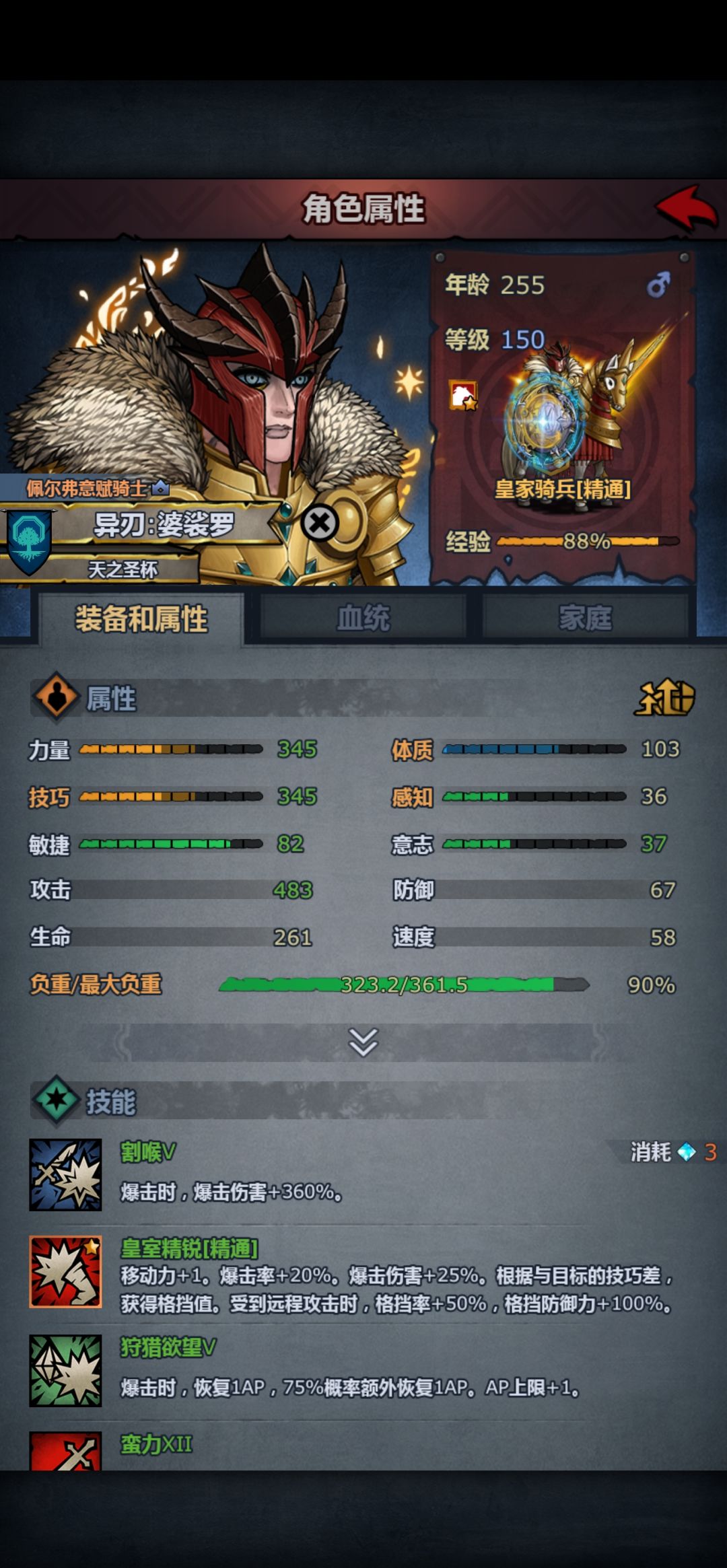 我这苗子还自带67%暴击,精通技巧打的伤害还是差精通力量一截,骑兵buff双倍攻击还是太爽了,得出的结论大概是精通技巧上限没有精通力量上限高