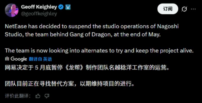 网易自2021年起资助该工作室长达五年,在评估后发现,其新作《Gang of Dragon》还需追加约70亿日元(约3亿人民币)才能完成,最终决定在游戏发售前撤资。目前名越稔洋正紧急寻找新投资方,但尚未取得进展。