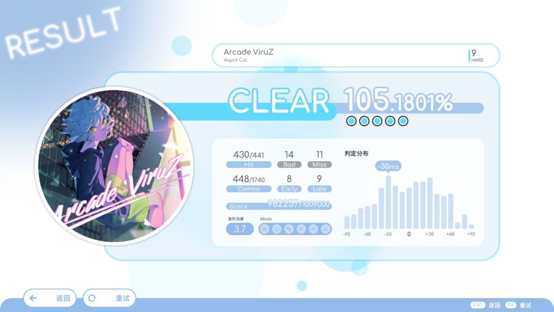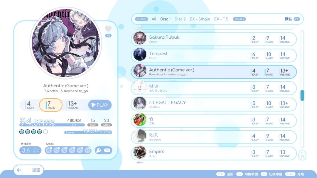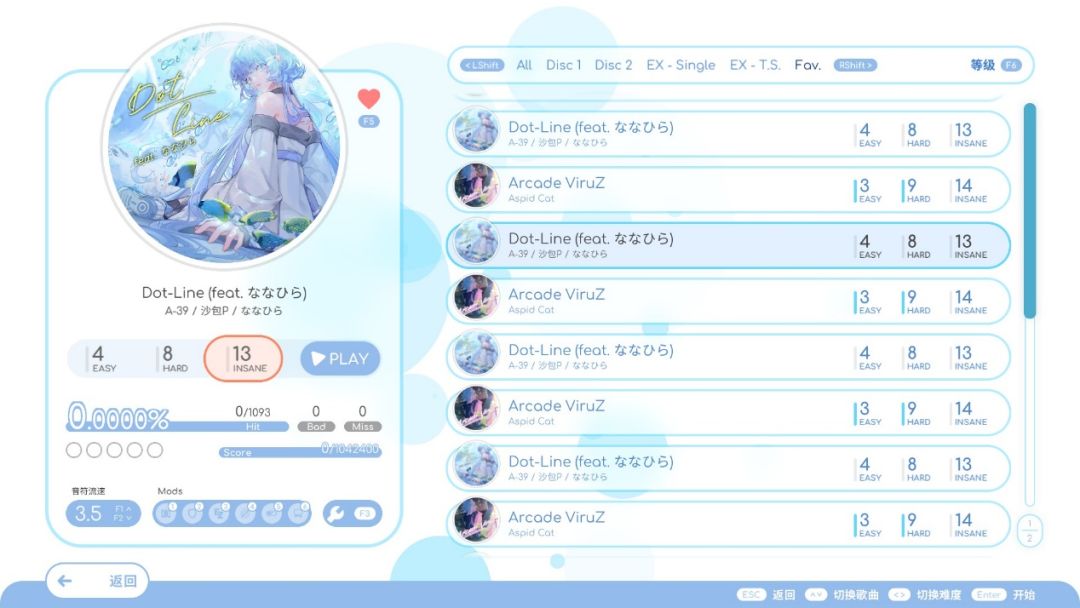 而在游戏中相关设置都藏在F3中生怕玩家找到,就不能正常像《Muse》《喵赛克》这些正常游戏一样,ESC把玩家需要的额外功能直接显现出来吗?原本的《Phigros》歌曲是阶梯性解锁的,分类也就不追究了,但沟槽的《Rizline》把《DJMAX》那乱七八糟的分类都学了,还继承了分类全是英文,汉化不完全的问题。