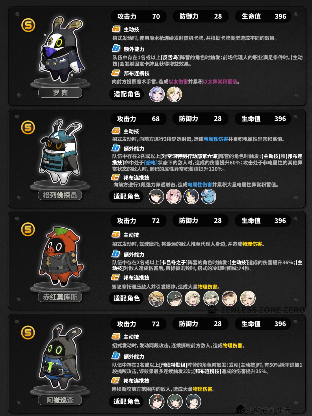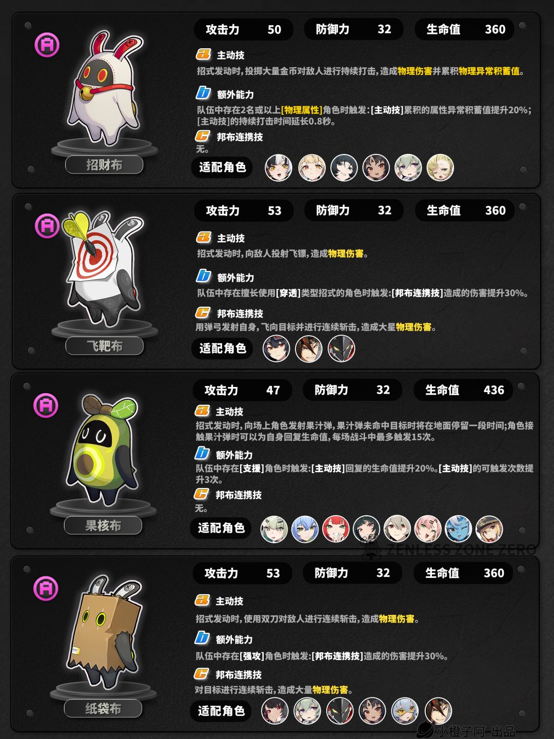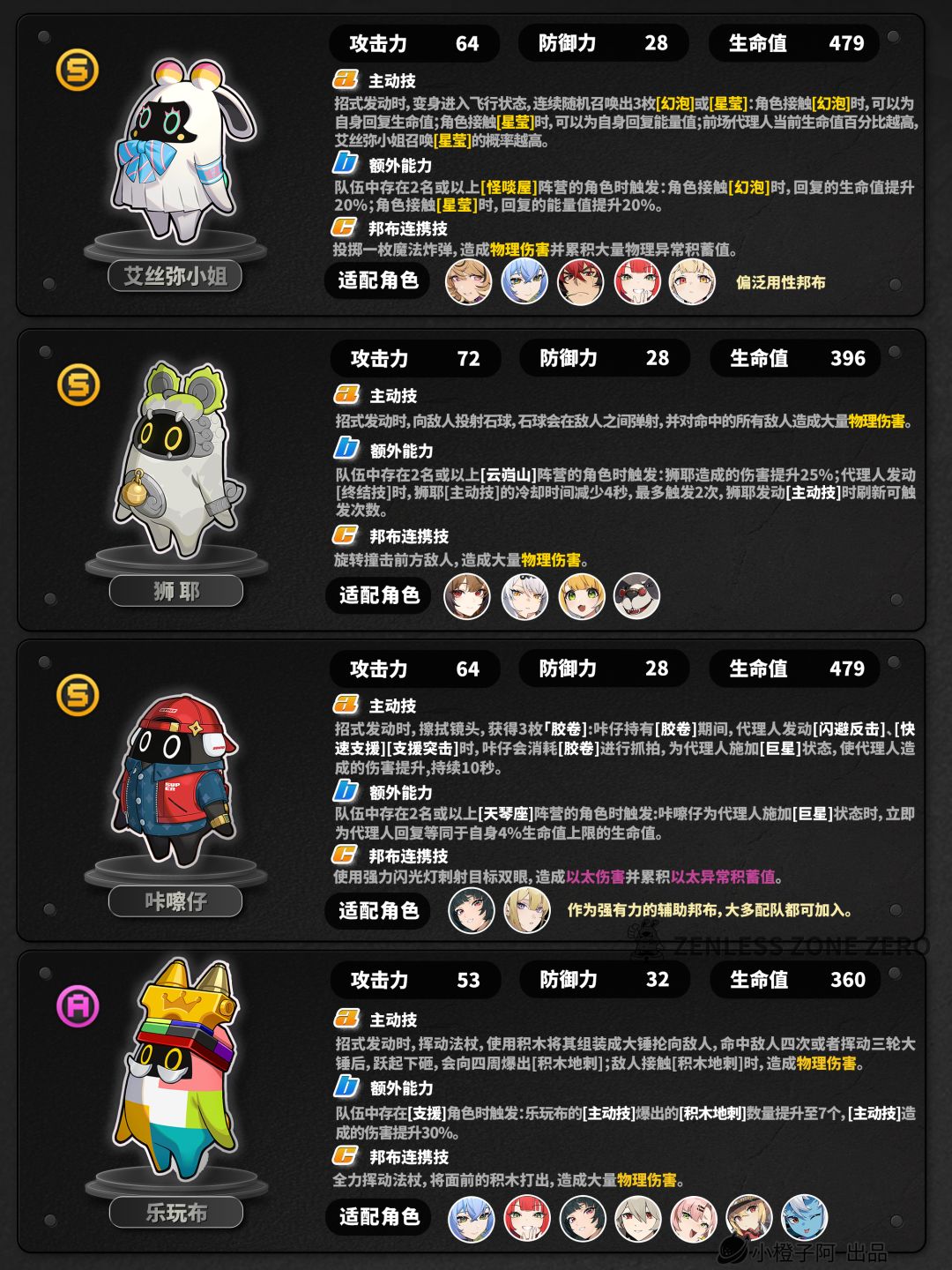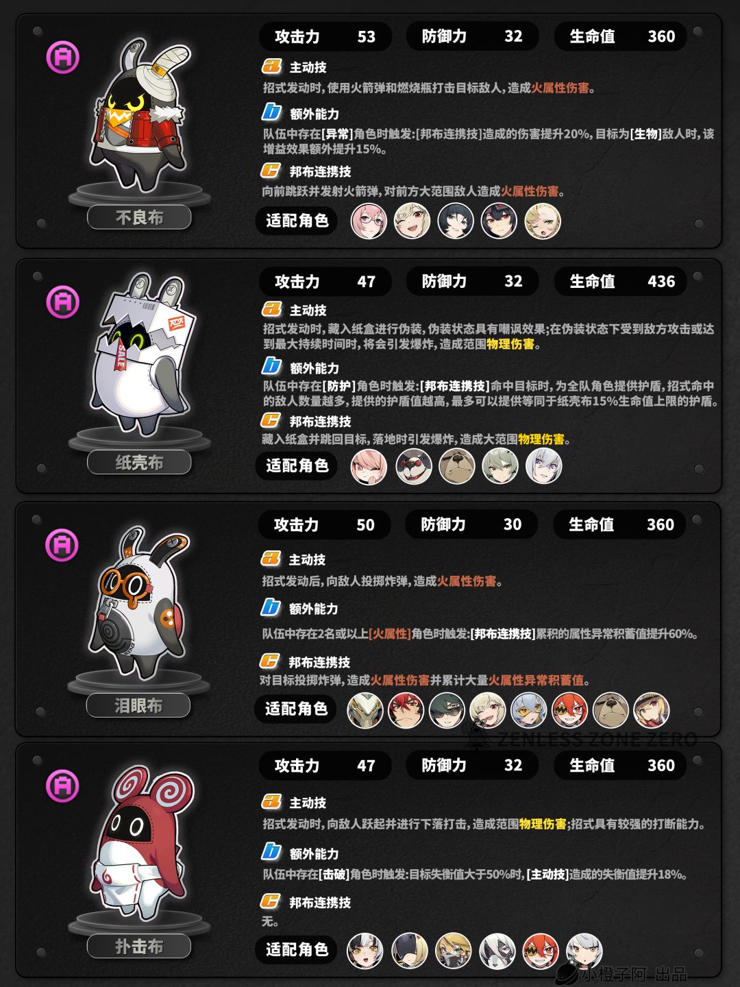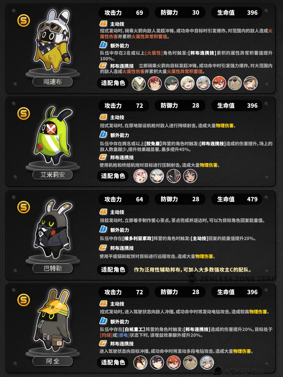 最主要的就是邦布完全免费,只需要通过活动等方式获得嗯呢券就能抽取合适自己配队的邦布,目前有38个邦布,S级19个,A级19个,它们的技能与代理人推荐如下方的图片所示~#游戏种草计划 #绝区零攻略 #绝区零旧梦的安可曲 #绝区零萌新指南 #绝区零邦布