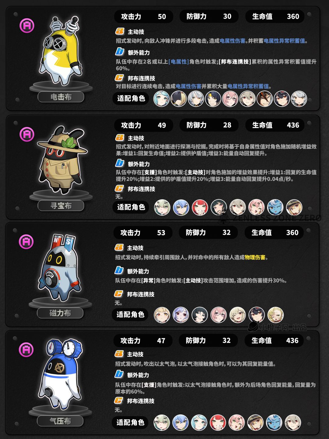 实战中邦布类似一个可爱跟宠,在卖萌的过程中为代理人战斗助力,邦布就像我们队伍的第四人,能通过不同能力协助作战,玩家需要根据代理人配队以及邦布要求(b技能)去选择合适的邦布进行搭配。