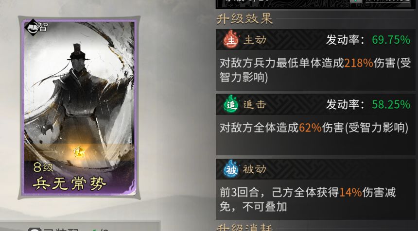主动技能固定携带【兵无常势】,发动时将对敌方兵力最低的单位造成伤害,能有效针对残血目标完成收割。
