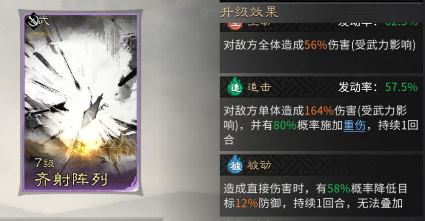 被动技能固定携带【齐射阵列】,在造成直接伤害时,有58%的概率降低目标12%的防御,此效果持续1回合且无法叠加。