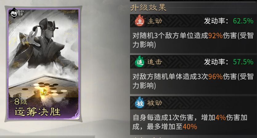 追击技能固定携带【运筹决胜】,可对敌方随机单体造成3次96%的伤害。